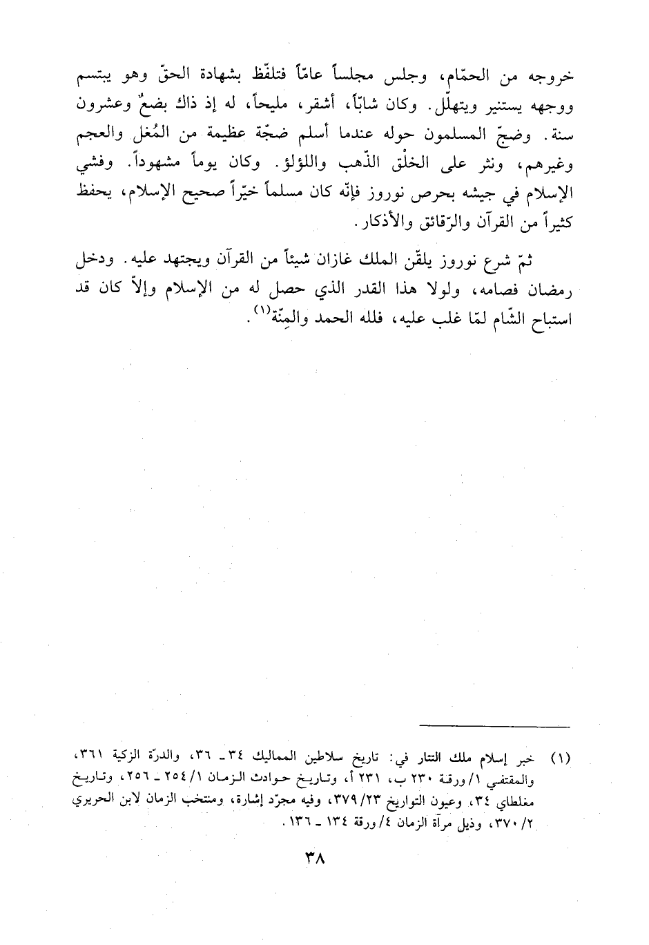 [1] خبر إسلام ملك التتار في: تاريخ سلاطين المماليك 34- 36، والدرّة الزكية 361، والمقتفي 1/ ورقة 230 ب، 231 أ، وتاريخ حوادث الزمان 1/ 254- 256، وتاريخ مغلطاي 34، وعيون التواريخ 23/ 379، وفيه مجرد إشارة، ومنتخب الزمان لابن الحريري 2/ 370، وذيل مرآة الزمان 4/ ورقة 134- 136.