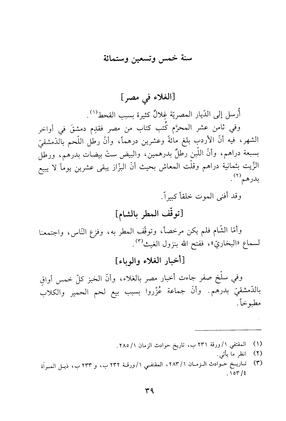 وفي ثامن عَشْر المُحَرَّم كُتب كتاب من مصر فقدِم دمشقَ فِي أواخر الشهر، فِيهِ أنّ الإردب بلغ مائة وعشرين درهما، وأن رطل اللّحم بالدمشقيّ بسبعة دراهم، وأنّ اللبن رطلٌ بدرهمين، والبيض ستّ بيضات بدرهم، ورطل الزَّيت بثمانية دراهم وقلّت المعاش بحيث أنّ البزّاز يبقى عشرين يَوْمًا لا يبيع بدرهم [2] .