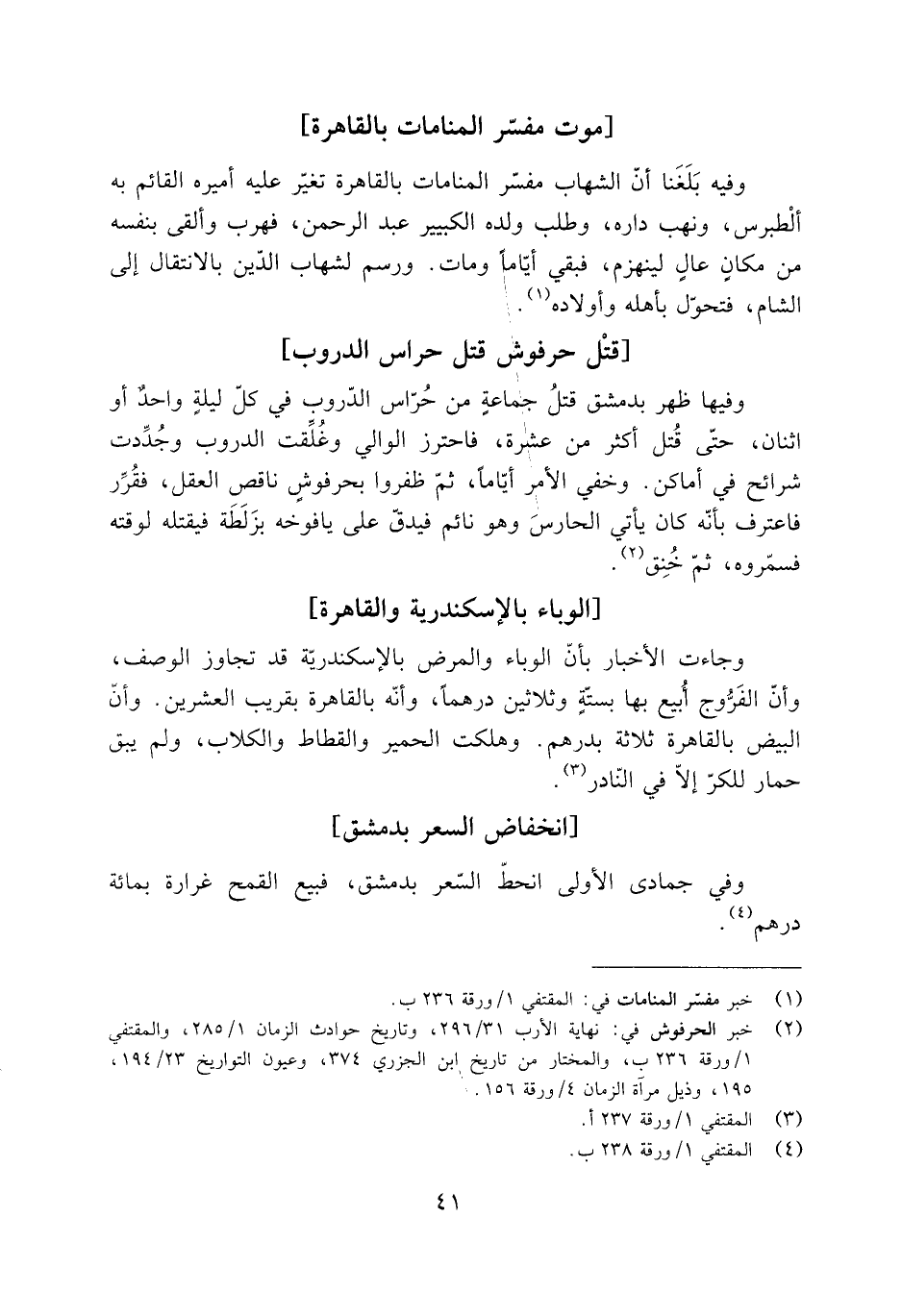 وجاءت الأخبار بأن الوباء والمرض بالإسكندرية قد تجاوز الوصف، وأنّ الفَرُّوج أُبيع بها بستّةٍ وثلاثين درهما، وأنّه بالقاهرة بقريب العشرين. وأن البيض بالقاهرة ثلاثة بدرهم. وهلكت الحمير والقطاط والكلاب، ولم يبق حمار للكرّ إلا فِي النّادر [3] .