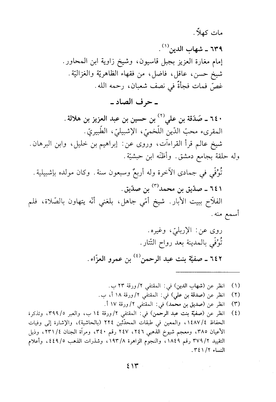 [4] انظر عن (صفية بنت عبد الرحمن) في: المقتفي 2/ ورقة 14 ب، والعبر 5/ 399، وتذكرة الحفاظ 4/ 1487، والمعين في طبقات المحدّثين 224 (بالحاشية) ، والإشارة إلى وفيات الأعيان 385، ومعجم شيوخ الذهبي 246، 247 رقم 340، ومرآة الجنان 4/ 231، وذيل التقييد 2/ 379 رقم 1849، والنجوم الزاهرة 8/ 193، وشذرات الذهب 5/ 449، وأعلام النساء 2/ 341.
