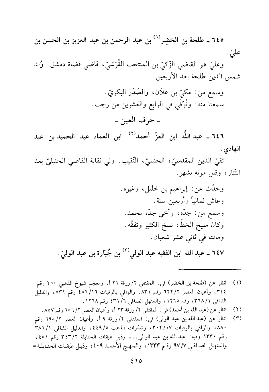 [3] انظر عن (عبد الله بن عبد الولي) في: المقتفي 2/ ورقة 9 أ، وأعيان العصر 2/ 695 رقم 880، والوافي بالوفيات 17/ 302، وشذرات الذهب 5/ 449، والدليل الشافي 1/ 386 رقم 1330 وفيه: عبد الله بن عبد الوالي ... ، وذيل طبقات الحنابلة 2/ 343 رقم 451، والمنهل الصافي 7/ 97 رقم 1333، والمنهج الأحمد 409، وذيل طبقات الحنابلة