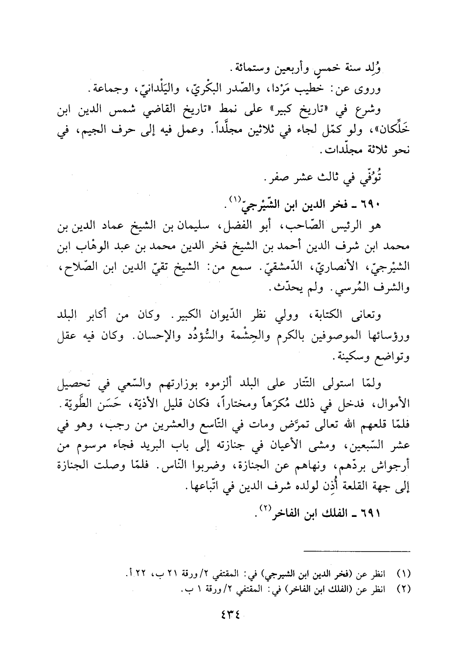 [1] انظر عن (فخر الدين ابن الشيرجي) في: المقتفي 2/ ورقة 21 ب، 22 أ