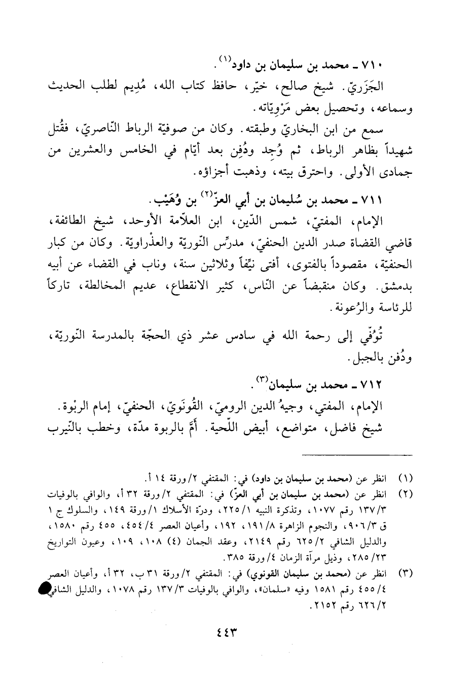 [3] انظر عن (محمد بن سليمان القونوي) في: المقتفي 2/ ورقة 31 ب، 32 أ، وأعيان العصر 4/ 455 رقم 1581 وفيه «سلمان» والوافي بالوفيات 3/ 137 رقم 1078، والدليل الشافي 2/ 626 رقم 2152.
