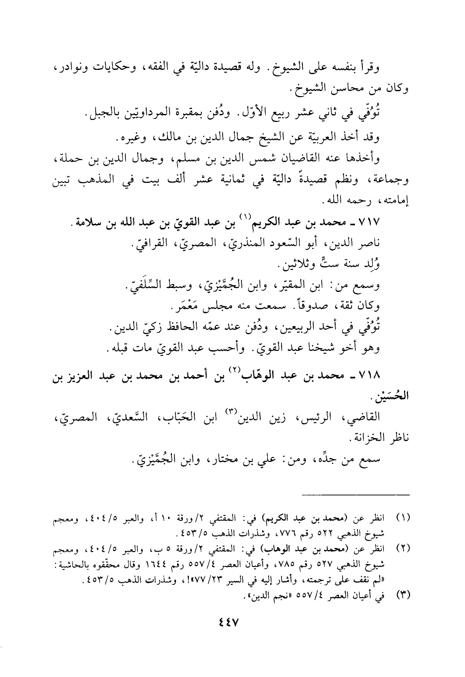 [1] انظر عن (محمد بن عبد الكريم) في: المقتفي 2/ ورقة 10 أ، والعبر 5 404، ومعجم شيوخ الذهبي 522 رقم 776، وشذرات الذهب 5/ 453.