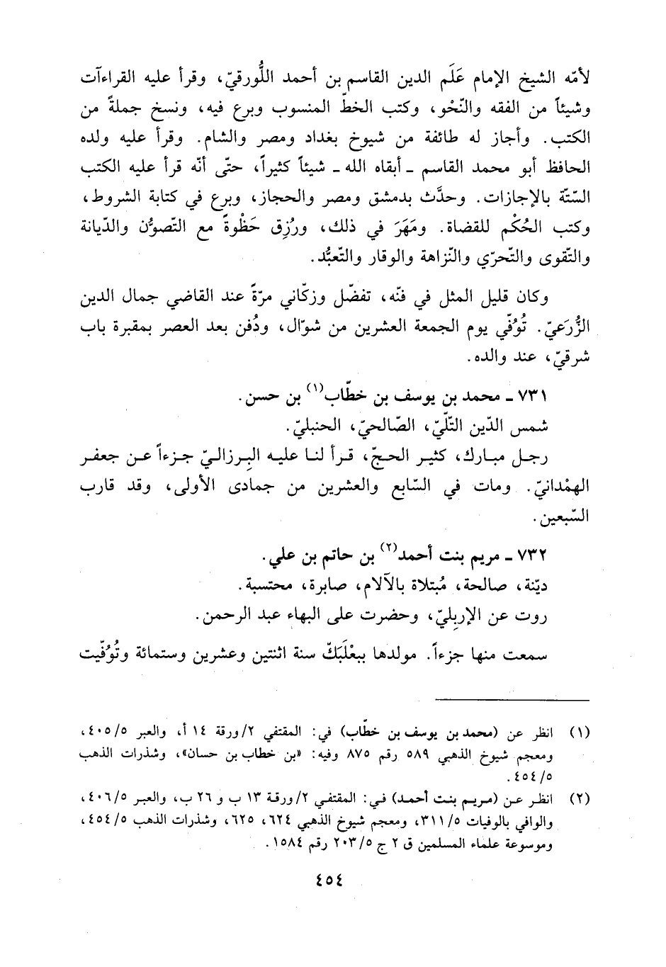 [2] انظر عن (مريم بنت أحمد) في: المقتفي 2/ ورقة 13 ب و 26 ب، والعبر 5/ 406، والوافي بالوفيات 5/ 311، ومعجم شيوخ الذهبي 624، 625، وشذرات الذهب 5/ 454، وموسوعة علماء المسلمين ق 2 ج 5/ 203 رقم 1584.