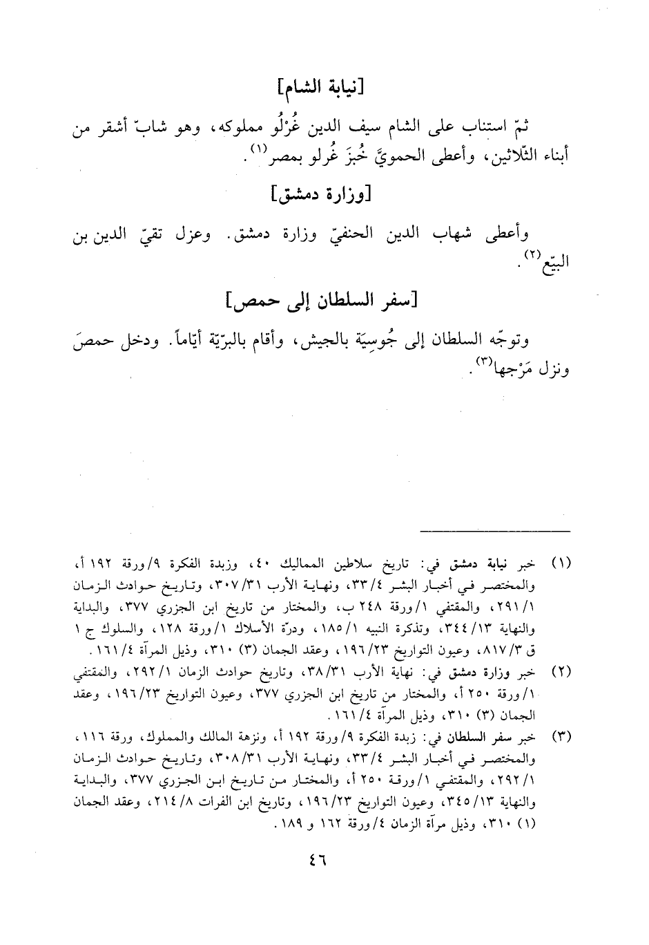 [3] خبر سفر السلطان في: زبدة الفكرة 9/ ورقة 192 أ، ونزهة المالك والمملوك، ورقة 116، والمختصر في أخبار البشر 4/ 33، ونهاية الأرب 31/ 308، وتاريخ حوادث الزمان 1/ 292، والمقتفي 1/ ورقة 250 أ، والمختار من تاريخ ابن الجزري 377، والبداية والنهاية 13/ 345، وعيون التواريخ 23/ 196، وتاريخ ابن الفرات 8/ 214، وعقد الجمان (1) 310، وذيل مرآة الزمان 4/ ورقة 162 و 189.