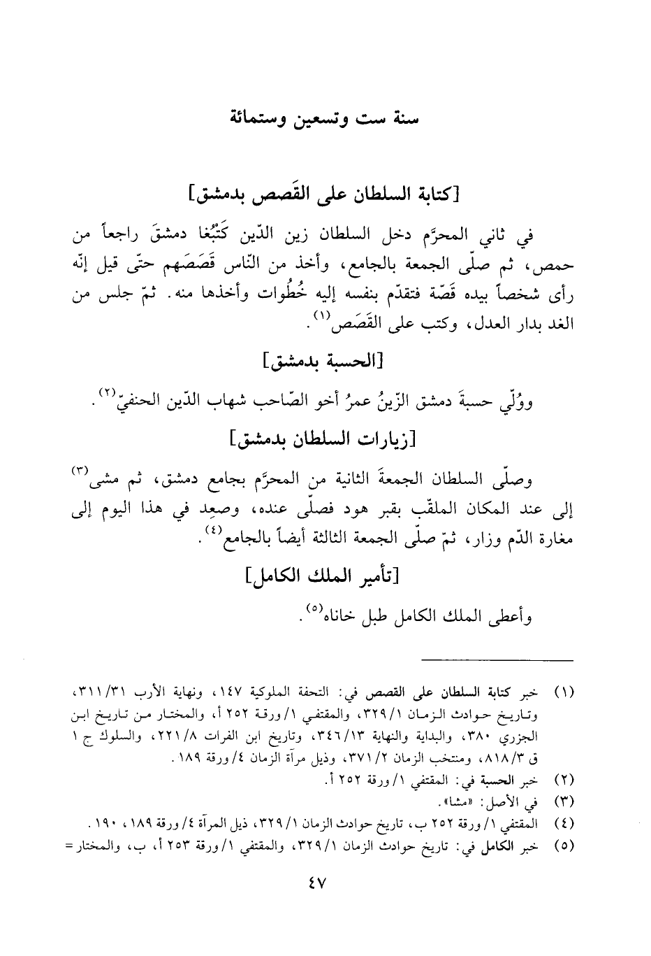 فِي ثاني المُحَرَّم دخل السلطان زين الدِّين كَتْبُغا دمشقَ راجعا من حمص، ثُمَّ صلى الْجُمُعَة بالجامع، وأخذ من النّاس قَصَصَهم حَتَّى قيل إنه رَأَى شخصا بيده قَصّة فتقدّم بنفسه إليه خُطُوات وأخذها منه. ثم جلس من الغدر بدار العدل، وكتب على القَصَص [1] .