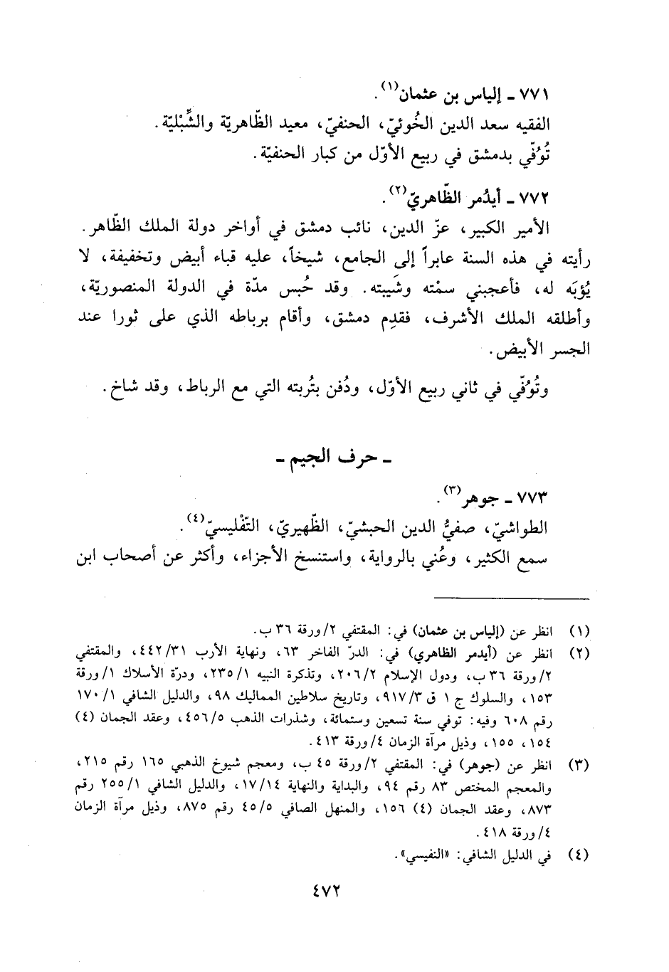[3] انظر عن (جوهر) في: المقتفي 2/ ورقة 45 ب، ومعجم شيوخ الذهبي 165 رقم 215، والمعجم المختص 83 رقم 94، والبداية والنهاية 14/ 17، والدليل الشافي 1/ 255 رقم 873، وعقد الجمان (4) 156، والمنهل الصافي 5/ 45 رقم 875، وذيل مرآة الزمان 4/ ورقة 418.