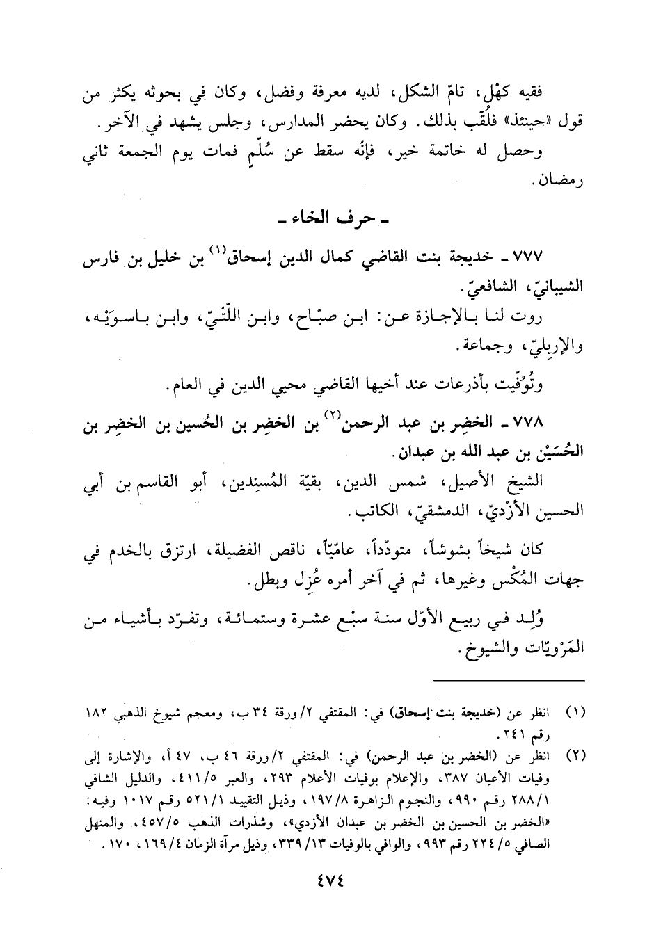 [2] انظر عن (الخضر بن عبد الرحمن) في: المقتفي 2/ ورقة 46 ب، 47 أ، والإشارة إلى وفيات الأعيان 387، والإعلام بوفيات الأعلام 293، والعبر 5/ 411، والدليل الشافي 1/ 288 رقم 990، والنجوم الزاهرة 8/ 197، وذيل التقييد 1/ 521 رقم 1017 وفيه: