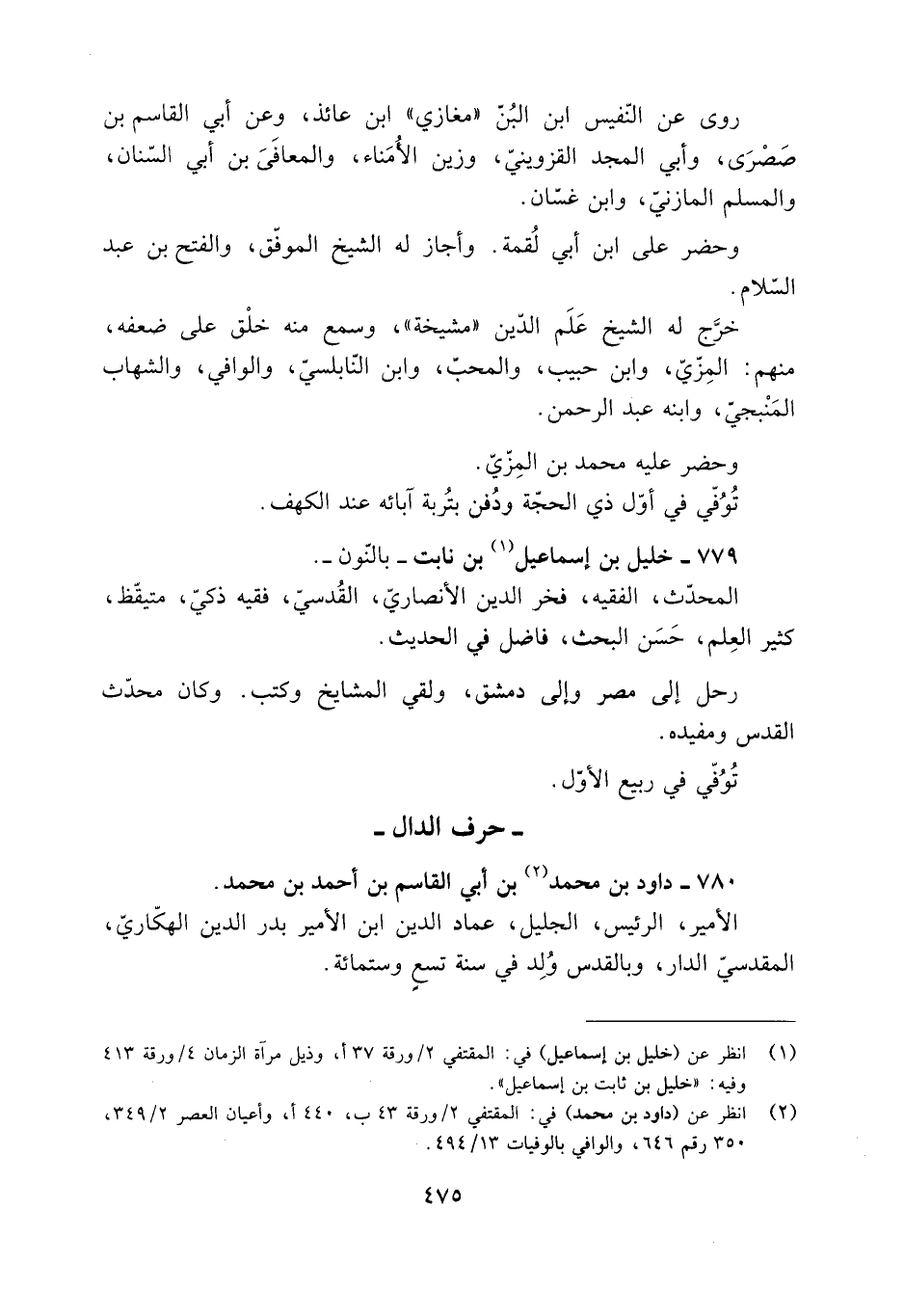 [2] انظر عن (داود بن محمد) في: المقتفي 2/ ورقة 43 ب، 440 أ، وأعيان العصر 2/ 349، 350 رقم 646، والوافي بالوفيات 13/ 494.
