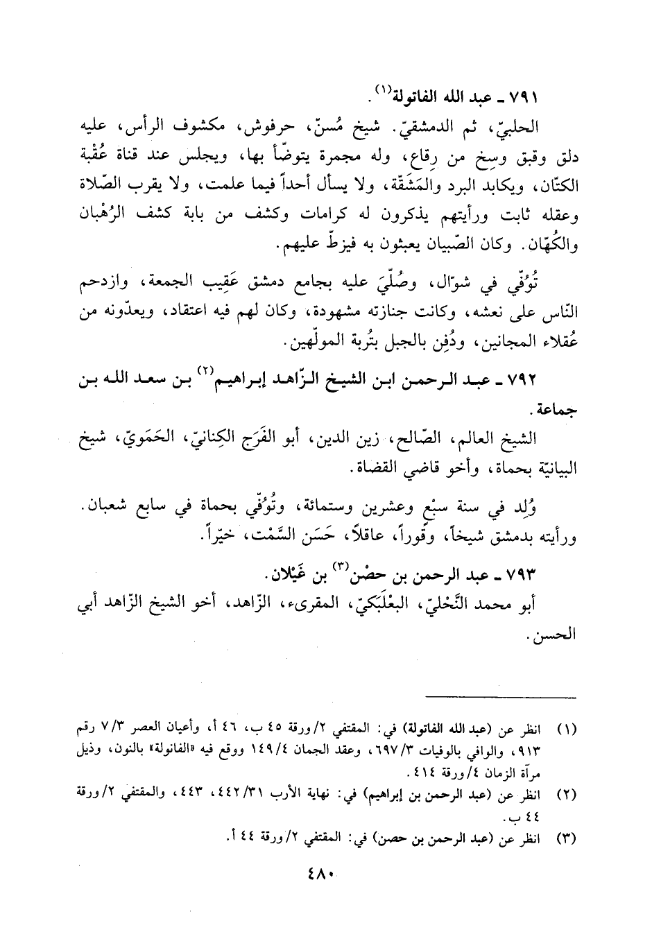 [1] انظر عن (عبد الله الفاتولة) في: المقتفي 2/ ورقة 45 ب، 46 أ، وأعيان العصر 3/ 7 رقم 913، والوافي بالوفيات 3/ 697، وعقد الجمان 4/ 149 ووقع فيه «الفانولة» بالنون، وذيل مرآة الزمان 4/ ورقة 414.