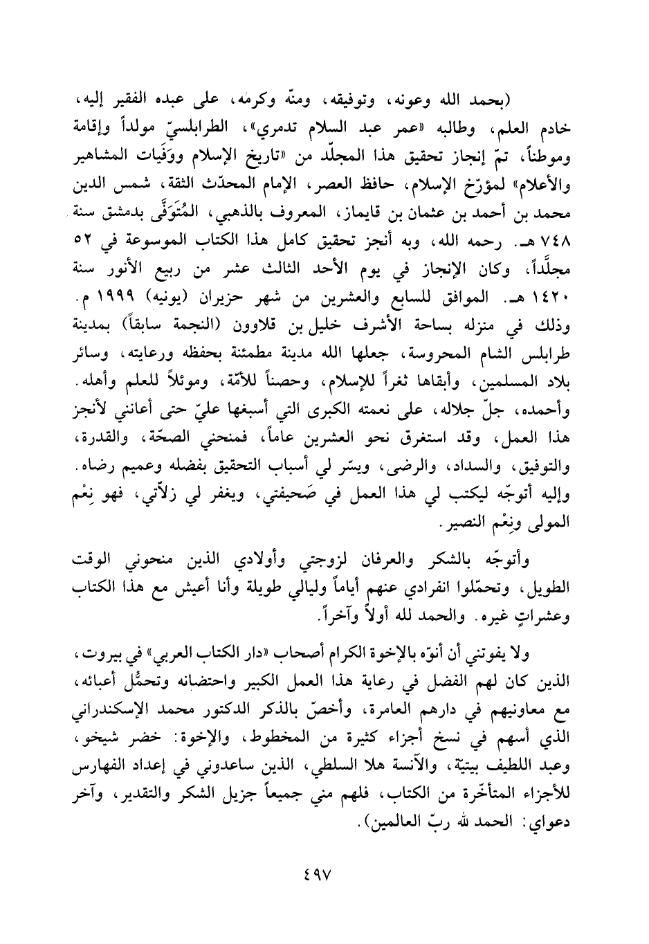 (بحمد الله وعونه، وتوفيقه، ومنّه وكرمه، على عبده الفقير إليه، خادم العلم، وطالبه «عمر عبد السلام تدمريّ» ، الطرابلسيّ مولدا وإقامة وموطنا، تمّ إنجاز تحقيق هذا المجلّد من «تاريخ الإسلام ووفيات المشاهير والأعلام» لمؤرّخ الإسلام، حافظ العصر، الإمام المحدّث الثقة، شمس الدين مُحَمَّد بْن أَحْمَد بْن عثمان بن قايماز، المعروف بالذهبي، المتوفّى بدمشق سنة 748 هـ. رحمه الله، وبه أنجز تحقيق كامل هذا الكتاب الموسوعة في 52 مجلّدا، وكان الإنجاز في يوم الأحد الثالث عشر من ربيع الأنور سنة 1420 هـ. الموافق للسابع والعشرين من شهر حزيران (يونيه) 1999 م.