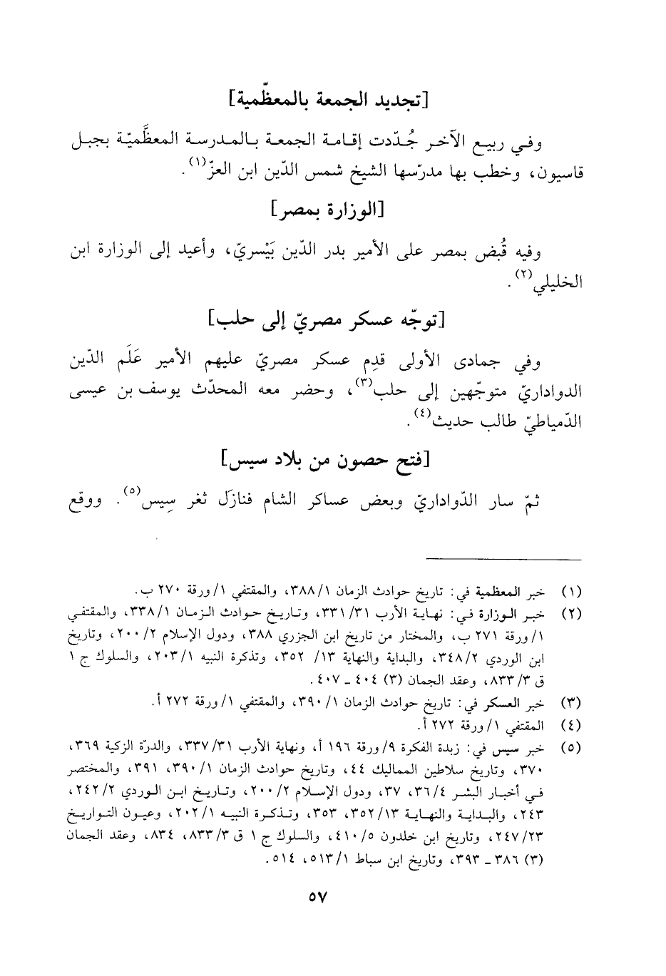 [5] خبر سيس في: زبدة الفكرة 9/ ورقة 196 أ، ونهاية الأرب 31/ 337، والدرّة الزكية 369، 370، وتاريخ سلاطين المماليك 44، وتاريخ حوادث الزمان 1/ 390، 391، والمختصر في أخبار البشر 4/ 36، 37، ودول الإسلام 2/ 200، وتاريخ ابن الوردي 2/ 242، 243، والبداية والنهاية 13/ 352، 353، وتذكرة النبيه 1/ 202، وعيون التواريخ 23/ 247، وتاريخ ابن خلدون 5/ 410، والسلوك ج 1 ق 3/ 833، 834، وعقد الجمان (3) 386- 393، وتاريخ ابن سباط 1/ 513، 514.