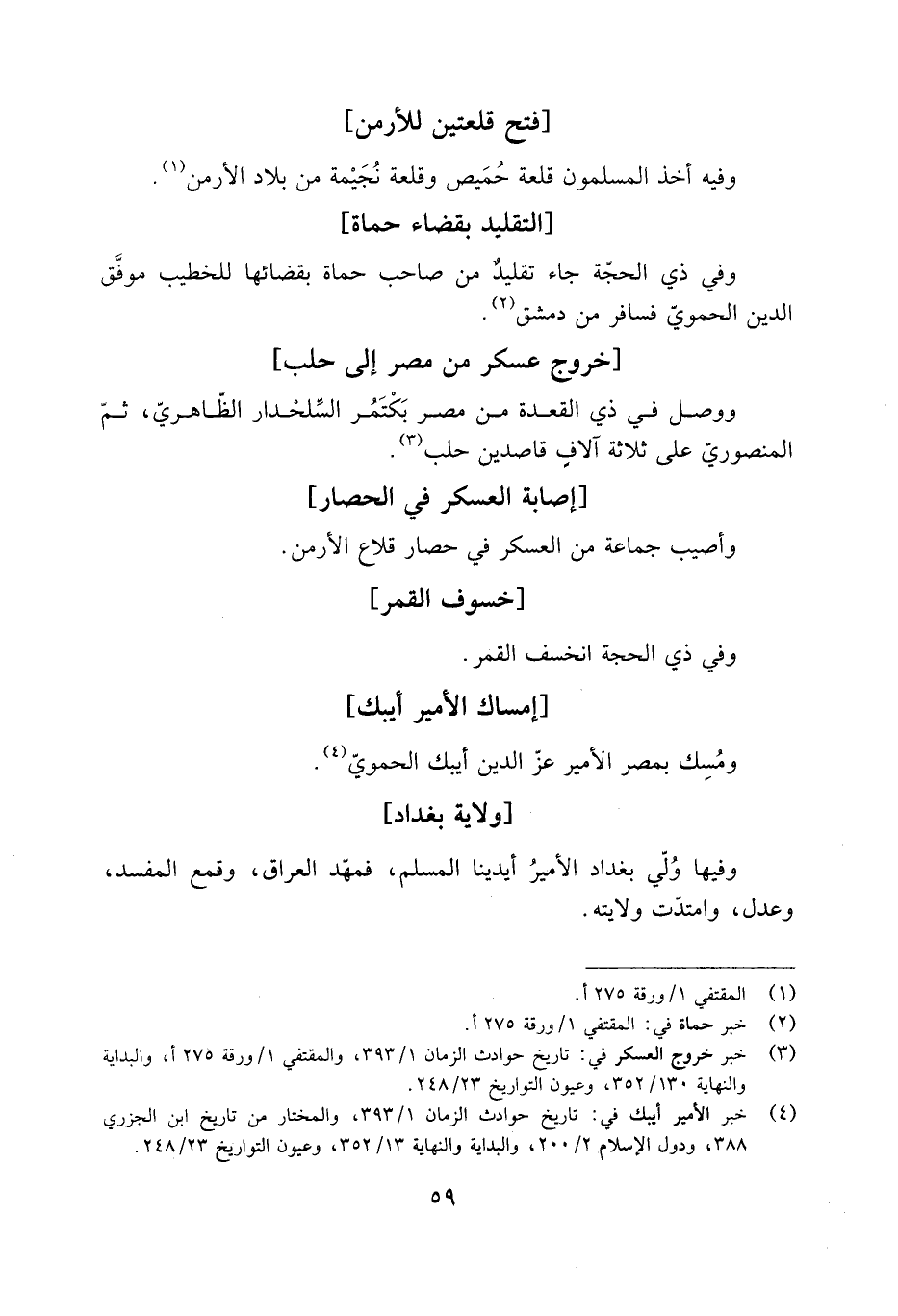 [3] خبر خروج العسكر في: تاريخ حوادث الزمان 1/ 393، والمقتفي 1/ ورقة 275 أ، والبداية والنهاية 130/ 352، وعيون التواريخ 23/ 248.