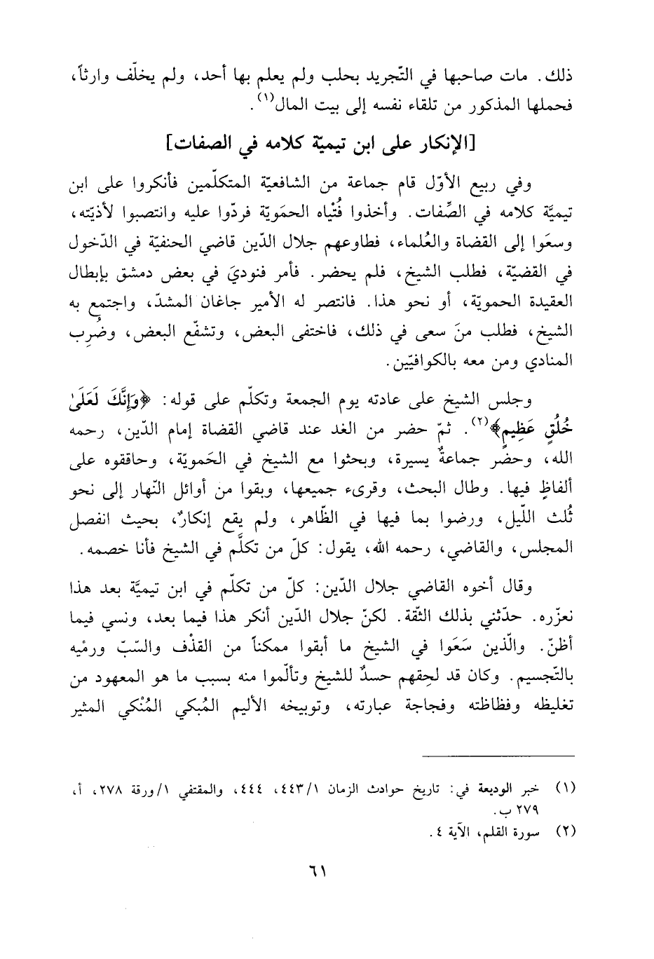 وفي ربيع الأول قام جماعة من الشافعية المتكلمين فأنكروا على ابن تيميَّة كلامه فِي الصَّفات. وأخذوا فُتْياه الحمَويّة فردّوا عليه وانتصبوا لأذيته، وسعوا إلى القضاة والعُلماء، فطاوعهم جلال الدِّين قاضي الحَنَفِيّة فِي الدّخول فِي القضية، فطلب الشَّيْخ، فلم يحضر. فأمر فنوديَ فِي بعض دمشق بإبطال العقيدة الحموية، أو نحو هذا. فانتصر له الأمير جاغان المشدّ، واجتمع به الشَّيْخ، فطلب منَ سعى فِي ذَلِكَ، فاختفى البعض، وتشفّع البعض، وضرب المنادي ومن معه بالكوافيّين.