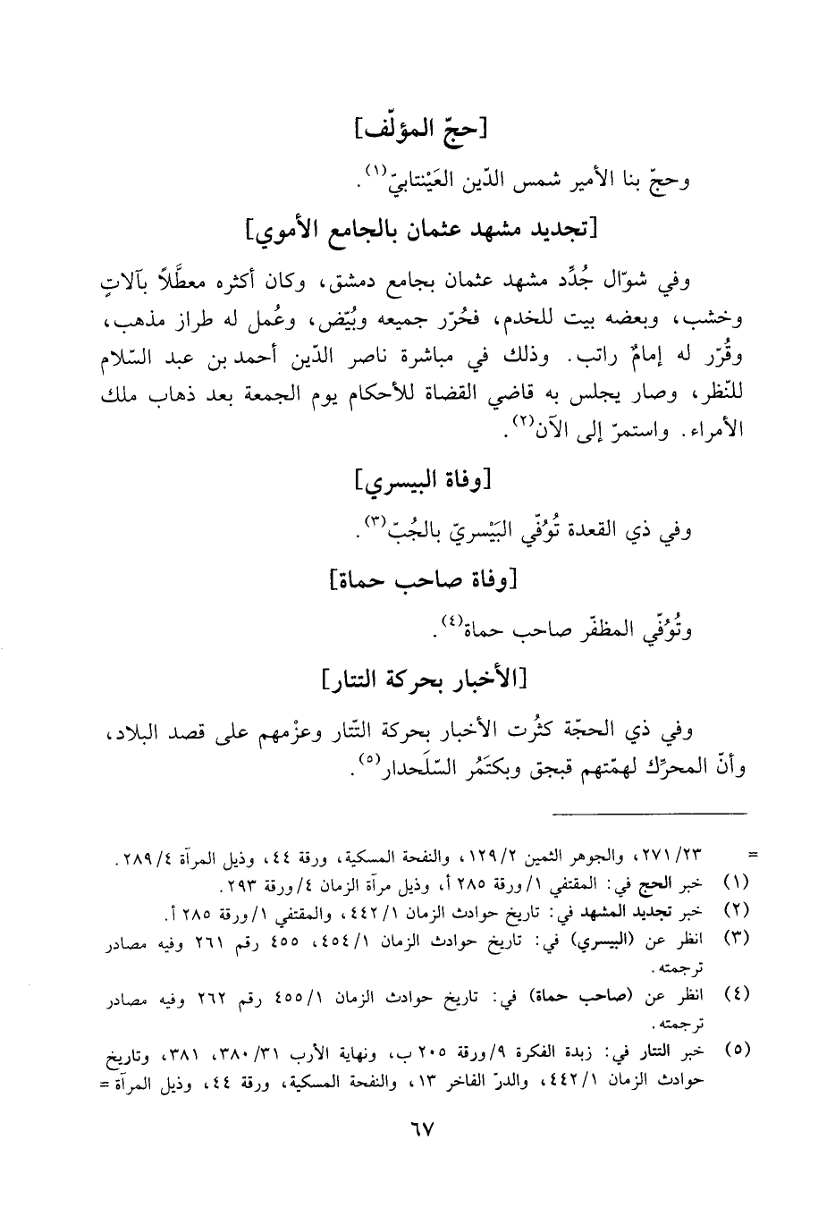 وفي شوّال جُدِّد مشهد عثمان بجامع دمشق، وكان أكثره معطِّلًا بآلاتٍ وخشب، وبعضه بيت للخدم، فحُرّر جميعه وبُيّض، وعُمل له طراز مذهب، وقُرّر له إمامٌ راتب. وذلك فِي مباشرة ناصر الدِّين أَحْمَد بْن عَبْد السلام للنّظر، وصار يجلس به قاضي القضاة للأحكام يوم الْجُمُعَة بعد ذهاب ملك الأمراء. واستمرّ إلى الآن [2] .