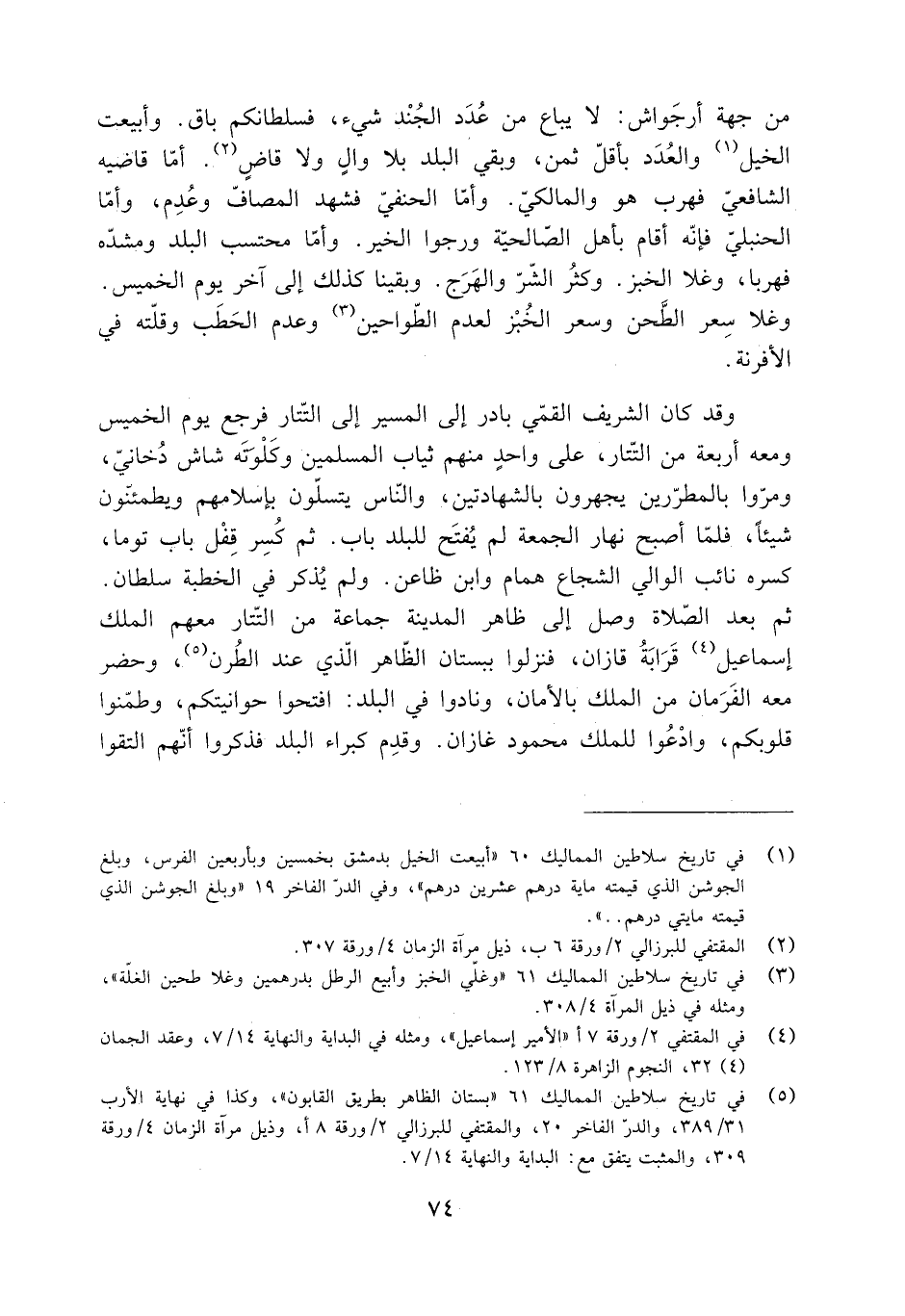 [1] في تاريخ سلاطين المماليك 60 «أبيعت الخيل بدمشق بخمسين وبأربعين الفرس، وبلغ الجوشن الّذي قيمته مائة درهم عشرين درهم» ، وفي الدر الفاخر 19 «وبلغ الجوشن الّذي قيمته مائتي درهم ... »