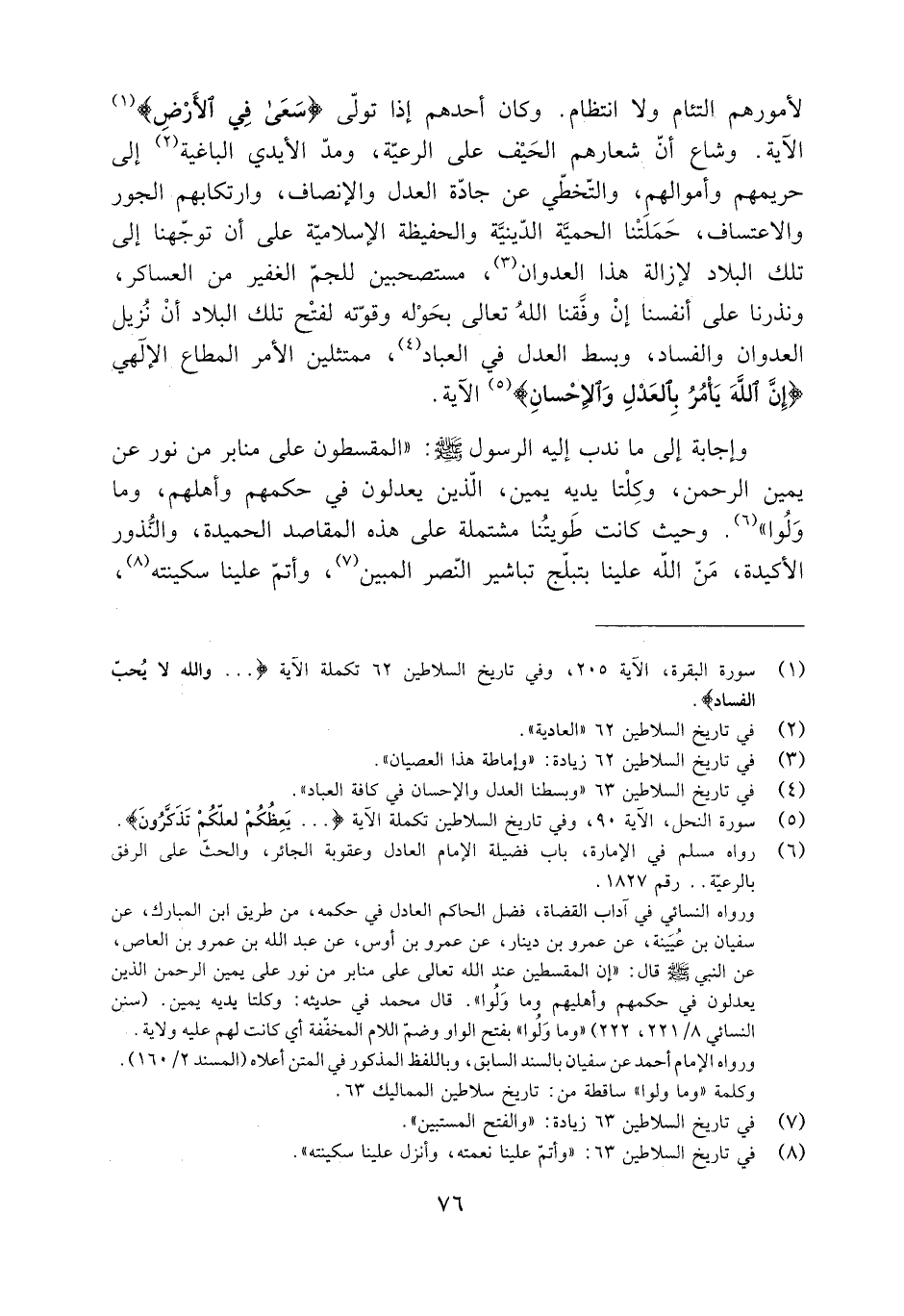 [4] في تاريخ السلاطين 63 «وبسطنا العدل والإحسان في كافة العباد» .