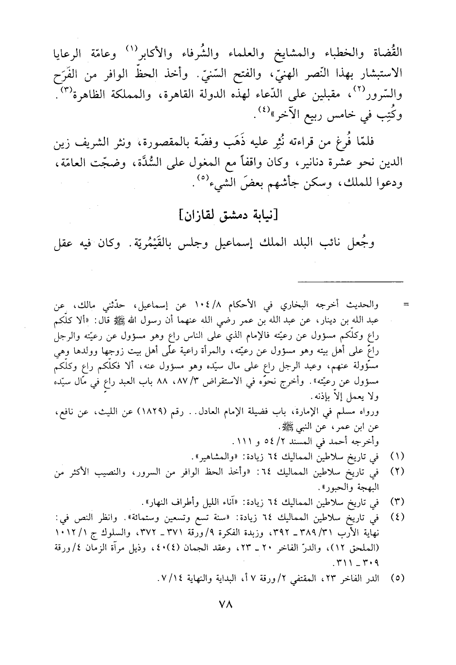 [2] في تاريخ سلاطين المماليك 64: «وأخذ الحظ الوافر من السرور، والنصيب الأكثر من البهجة والحبور» .