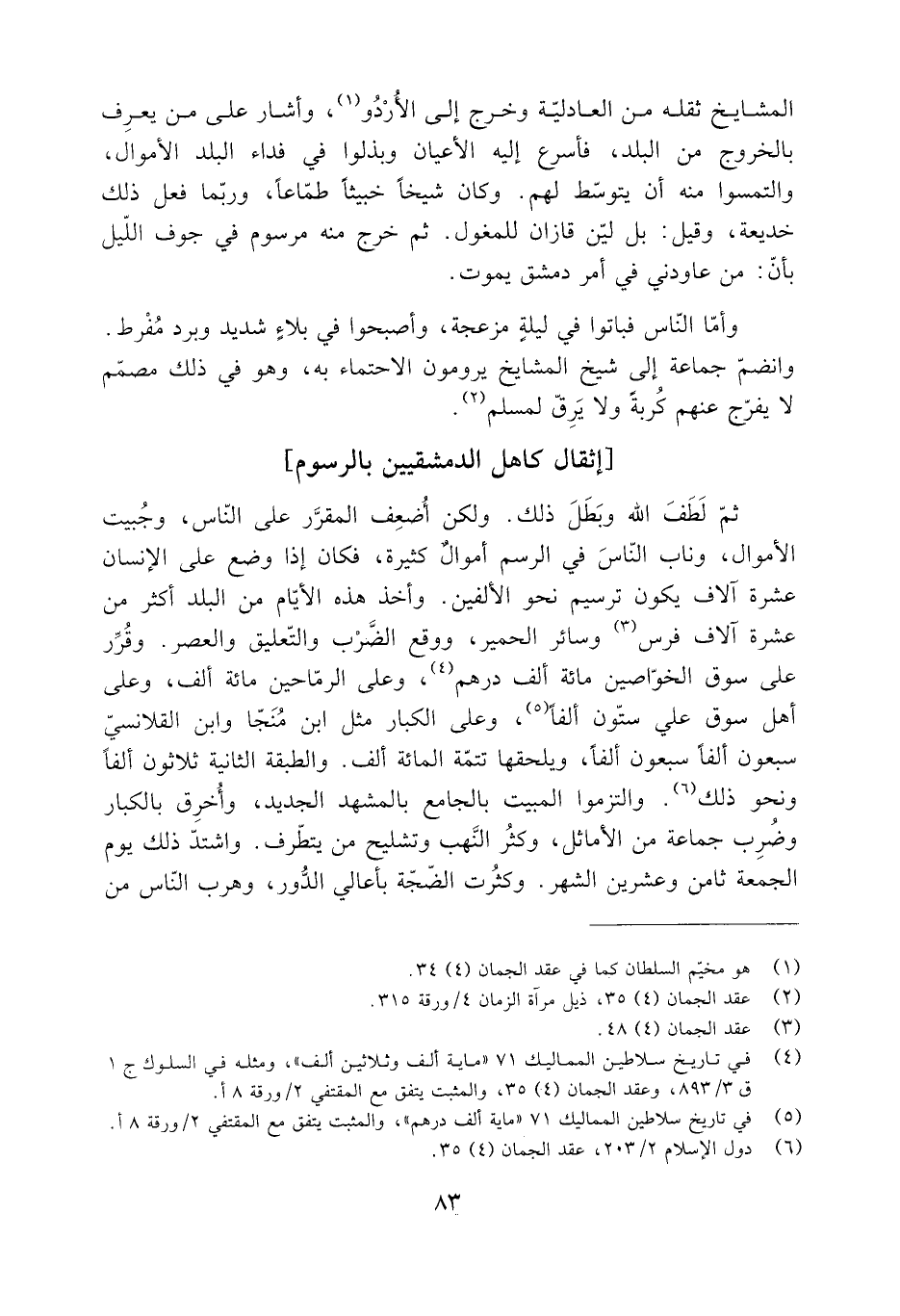 ثُمَّ لَطَفَ اللَّه وبَطَلَ ذَلِكَ. ولكن أُضعِف المقرَّر على النّاس، وجُبيت الأموال، وناب الناسَ فِي الرسم أموال كثيرة، فكان إذا وضع على الإِنْسَان عشرة آلاف يكون ترسيم نحو الألفين. وأخذ هذه الأيام من البلد أكثر من عشرة آلاف فرس [3] وسائر الحمير، ووقع الضَّرْب والتّعليق والعصر. وقُرِّر على سوق الخواصين مائة ألف درهم [4] ، وعلى الرمّاحين مائة ألف وعلى أهل سوق علي ستون ألفا [5] ، وعلى الكبار مثل ابن منجا وابن القلانسيّ سبعون ألفا سبعون ألفا، ويلحقها تتمّة المائة ألف. والطبقة الثانية ثلاثون ألفا ونحو ذَلِكَ [6] . والتزموا المبيت بالجامع بالمشهد الجديد، وأُخرِق بالكبار وضُرِب جماعة من الأماثل، وكثُر النَّهب وتشليح من يتطرف. واشتدّ ذَلِكَ يوم الجمعة ثامن وعشرين الشهر. وكثُرت الضّجة بأعالي الدُّور، وهرب النّاس من