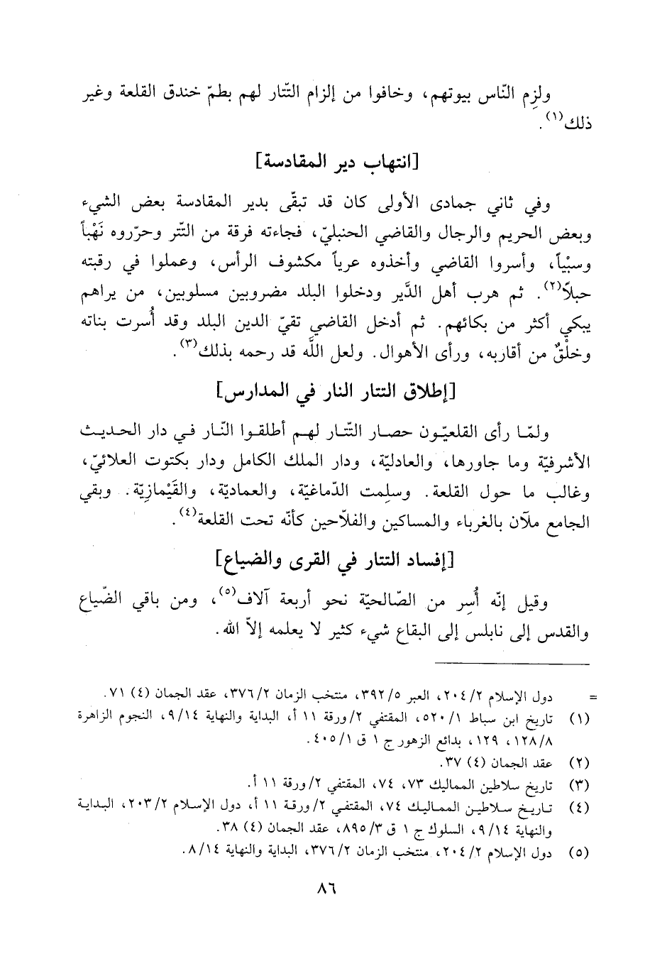 وفي ثاني جمادى الأولى كان قد تبقى بدير المقادسة بعض الشَّيء وبعض الحريم والرجال والقاضي الحنبليّ، فجاءته فرقة من التتر وحرّروه نَهْبًا وسبْيًا، وأسروا القاضي وأخذوه عريا مكشوف الرأس، وعملوا فِي رقبته حبلا [2] . ثُمَّ هرب أهل الدَّير ودخلوا البلد مَضْرُوبينَ مَسْلوبين، مَنْ يراهم يَبكي أكثر من بُكائهم. ثُمَّ أدخل القاضي تقيّ الدِّين البلد وقد أُسِرَتْ بَنَاته وخلقٌ من أقاربه، ورأى الأهوال. ولعل اللَّه قد رحمه بذلك [3] .