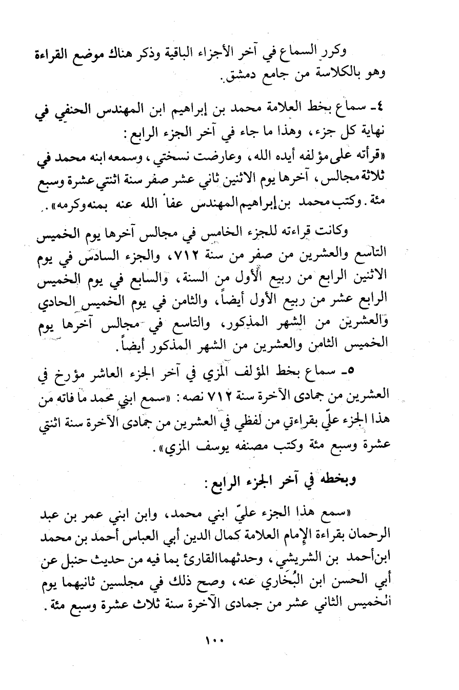 5- سماع بخط المؤلف المزي في آخر الجزء العاشر مؤرخ في العشرين من جمادى الآخرة سنة 712 نصه: سمع ابني محمد ما فاته من هذا الجزء علي بقراءتي من لفظي في العشرين من جمادي الأخرة سنة اثنتي عشرة وسبع مئة وكتب مصنفه يوسف المزي.