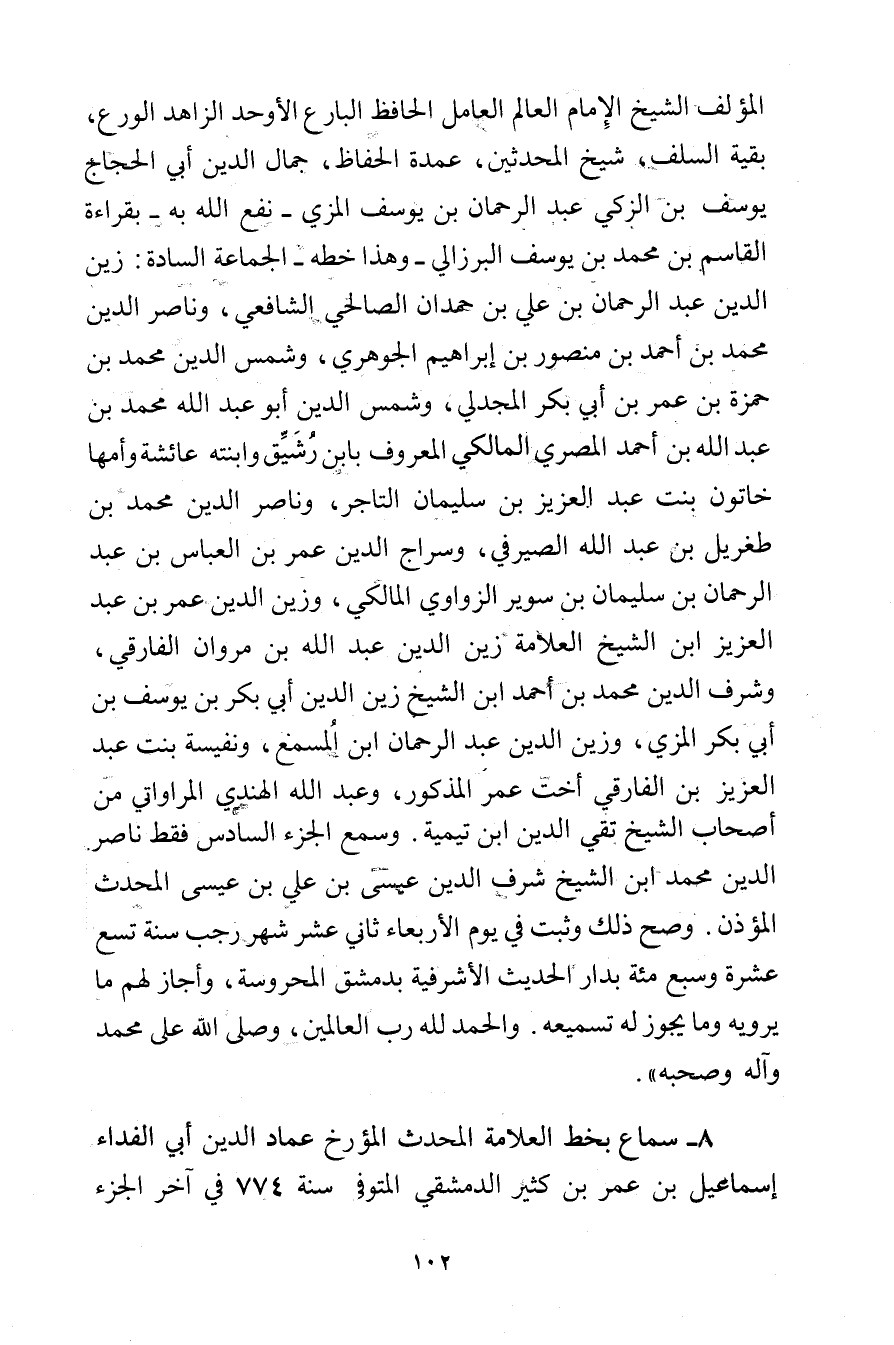 8- سماع بخط العلامة المحدث المورخ عماد الدين أبي الفداء إسماعيل بن عُمَربن كثير الدمشقي المتوفى سنة 774 في آخر الجزء