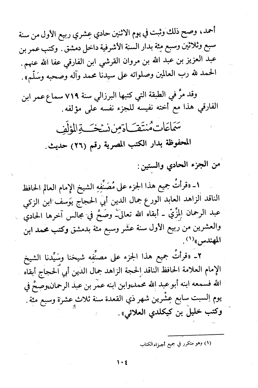 1-"قرأت جميع هذا الجزء على مصنفه الشيخ الإمام العالم الحافظ الناقد الزاهد العابد الورع جمال الدين أبي الحجاج يوسف ابن الزكي عبد الرحمن المزي أبقاه الله تعالى وصح في مجالس آخرها الحادي والعشرين من ربيع الاول سنة عشر وسبع مئة بدمشق وكتب محمد ابن المهندس" (1) .