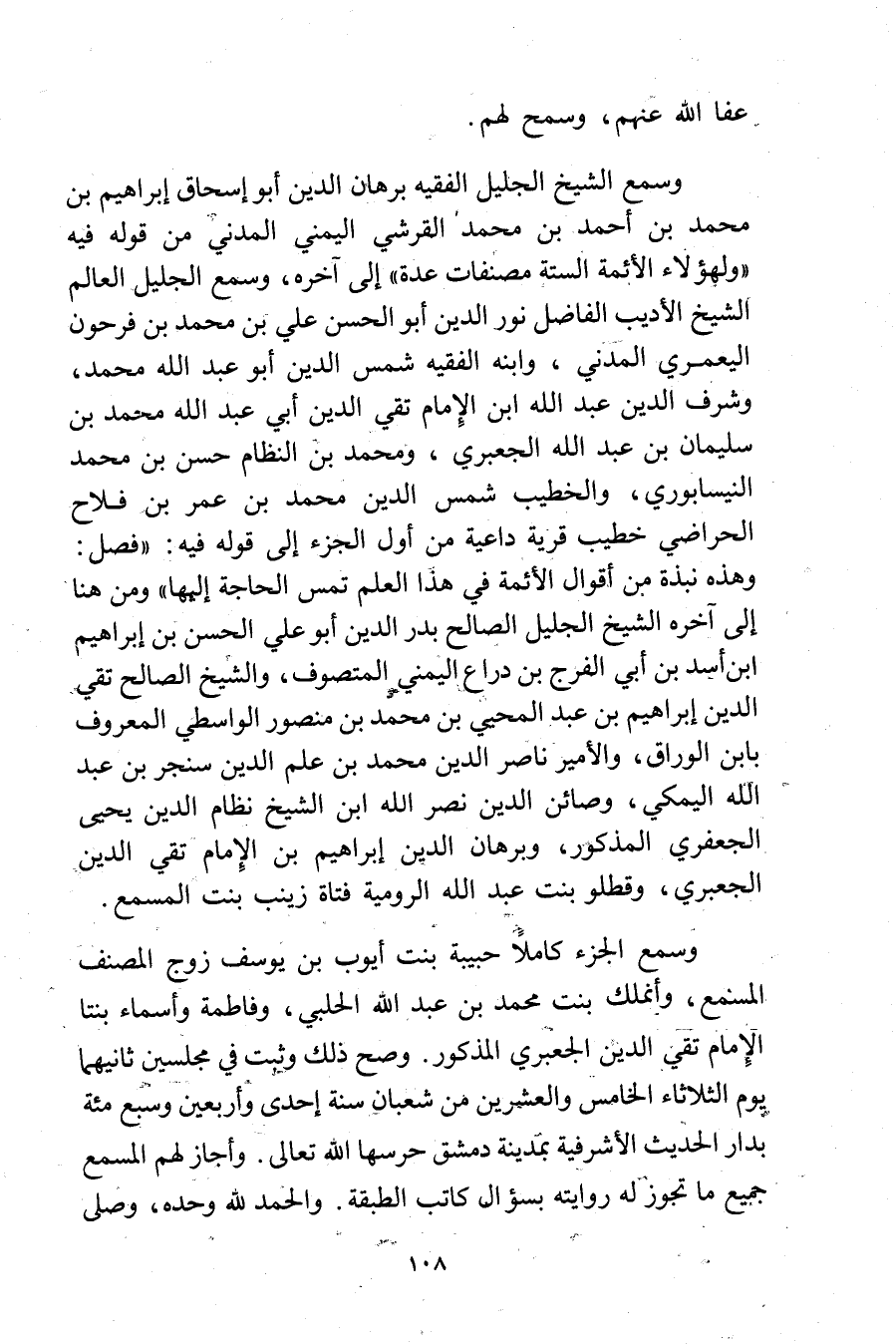 وسمع الشيخ الجليل الفقيه برهان الدين أبو إسحاق إِبْرَاهِيم بْن مُحَمَّد بن أحمد بن محمد القرشي اليمني المدني من قوله فيه"ولهؤلاء الأئمة الستة مصنفات عدة"إلى آخره، وسمع الجليل العالم الشيخ الاديب الفاضل نور الدين أَبُو الْحَسَن علي بْن مُحَمَّد بن فرحون اليعُمَري المدني، وابنه الفقيه شمس الدين أبو عبد الله محمد، وشرف الدين عَبد الله بن الإمام تقي الدين أَبِي عَبد اللَّهِ مُحَمَّد بْن سُلَيْمان بن عَبد الله الجعبري، ومحمد بن النظام حسن بن محمد النيسابوري، والخطيب شمس الدين محمد بن عُمَر بن فلاح الحراضي خطيب قرية داعية من أول الجزء إلى قوله فيه: فصل: وهذه نبذة من أقوال الأئمة في هذا العلم تمس الحاجة إليها"ومن هنا إلى آخره الشيخ الجليل الصالح بدر الدين أبو علي الحسن بن إبراهيم ابن أسد بن أَبي الفرج بن دراع اليمني المتصوف، والشيخ الصالح تقي الدين إبراهيم بن عبد المحيي بن محمد بن منصور الواسطي المعروف بابن الوراق، والامير ناصر الدين محمد بن علم الدين سنجر بن عبد الله اليمكي، وصائن الدين نصر الله بن الشيخ نظام الدين يحيى الجعفري المذكور، وبرهان الدين إبراهيم بن الإمام تقي الدين الجعبري، وقطلو بنت عَبد الله الرومية فتاة زينب بنت المسمع.