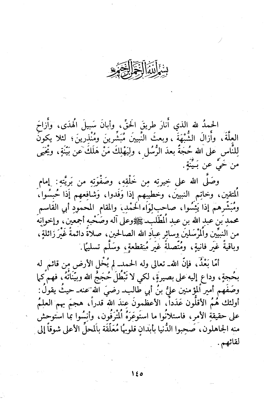 أما بعد، فإن الله تعالى وله الحمد لم يخل الارض من قائم له بحجة، وداع إليه على بصيرة، لكي لا تبطل حجج الله وبيناته، فهم كما وصفهم أمير المؤمنين علي بْن أَبي طالب رضي الله عنه حيث يقول: أولئك هم الأقلون عدداً، الأعظمون عند الله قدرا، هجم بهم العلم على حقيقة الامر، فاستلانوا ما استوعره المترفون، وأنسوا بما استوحش منه الجاهلون، صحبوا الدنيا بأبدان قلوبها معلقة بالمحل الاعلى شوقا إلى لقائهم.