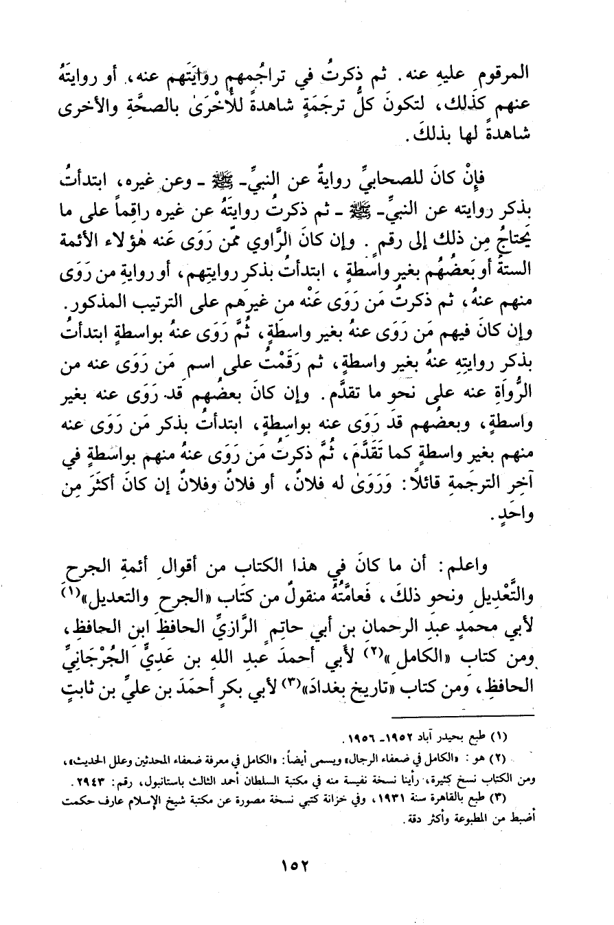 (2) هو: الكامل في ضعفاء الرجال"ويسمى أيضا: الكامل في معرفة ضعفاء المحدثين وعلل الحديث"، ومن الكتاب نسخ كثيرة، رأينا نسخة نفيسة منه في مكتبة السلطان أحمد الثالث باستانبول، رقم: 2943.