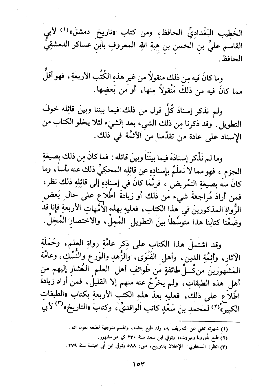 وقد اشتمل هذا الكتاب على ذكر عامة رواة العلم، وحملة الآثار، وأئمة الدين، وأهل الفتوى، والزهد والورع والنسك، وعامة المشهورين من كل طائفة من طوائف أهل العلم المشار إليهم من أهل هذه الطبقات، ولم يخرج عنه منهم إلا القليل، فمن أراد زيادة اطلاع على ذلك، فعليه بعد هذه الكتب الأربعة بكتاب"الطبقات الكبير" (2) لمحمد بن سعد كاتب الواقدي، وكتاب"التاريخ" (3) لابي