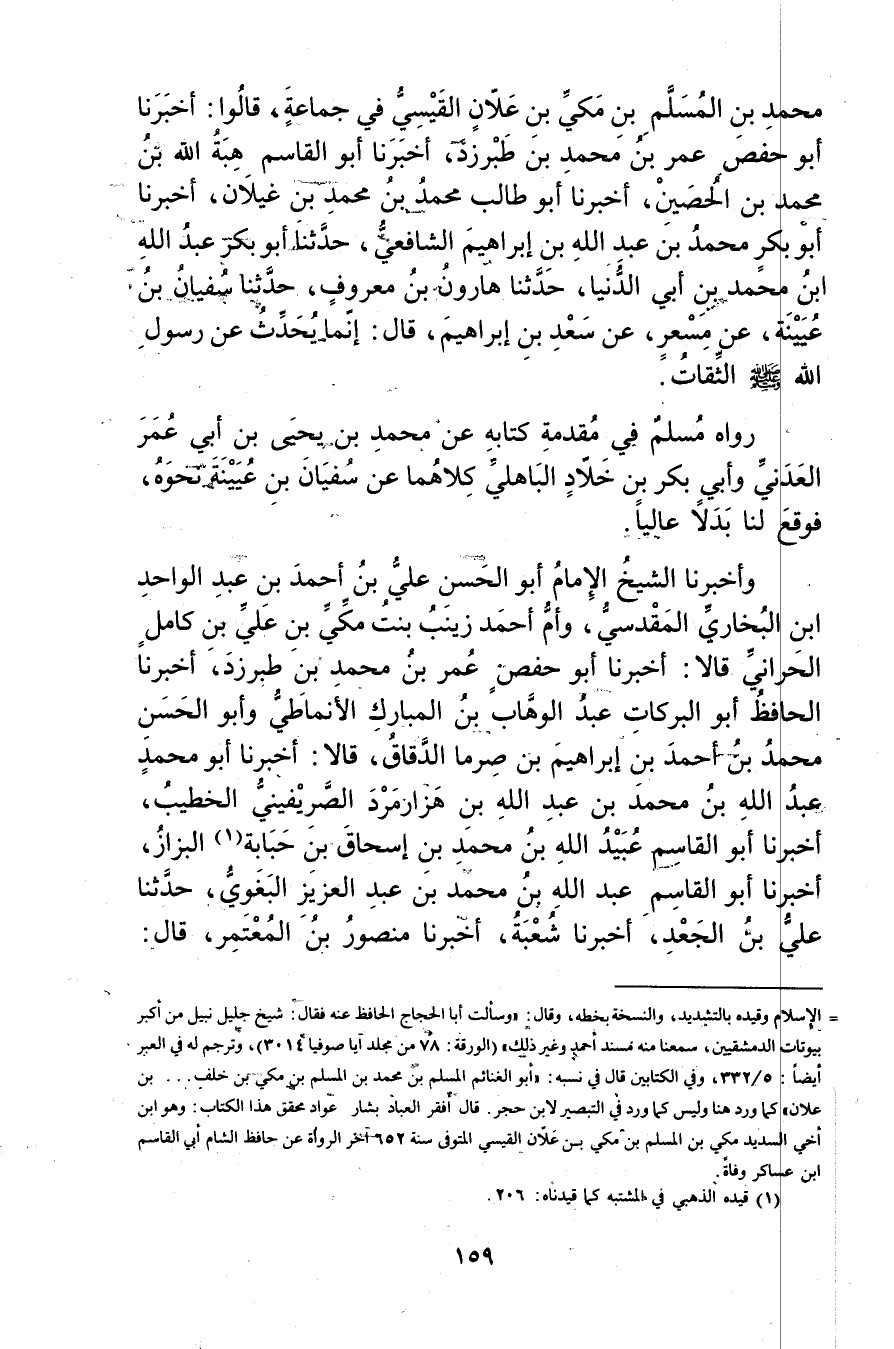 = الاسلام وقيده بالتشديد، والنسخة بخطه، وَقَال: وسألت أبا الحجاج الحافظ عنه فقال: شيخ جليل نبيل من أكبر بيوتات الدمشقيين، سمعنا منه مسند أحمد وغير ذلك" (الورقة: 78 من مجلد آيا صوفيا 3014) ، وترجم له في العبر أيضا: 5 / 332، وفي الكتابين قال في نسبه: أَبُو الغنائم المسلم بْن مُحَمَّد بن المسلم بن مكي بن خلف..بن علان"كما ورد هنا وليس ما ورد في التبصير لابن حجر قال أفقر العباد بشار عواد محقق هذا الكتاب: وهو ابن أخي السديد مكي بن المسلم بن مكي بن علان القيسي المتوفى سنة 652 آخر الرواة عن حافظ الشام أبي القاسم ابن عساكر وفاة.