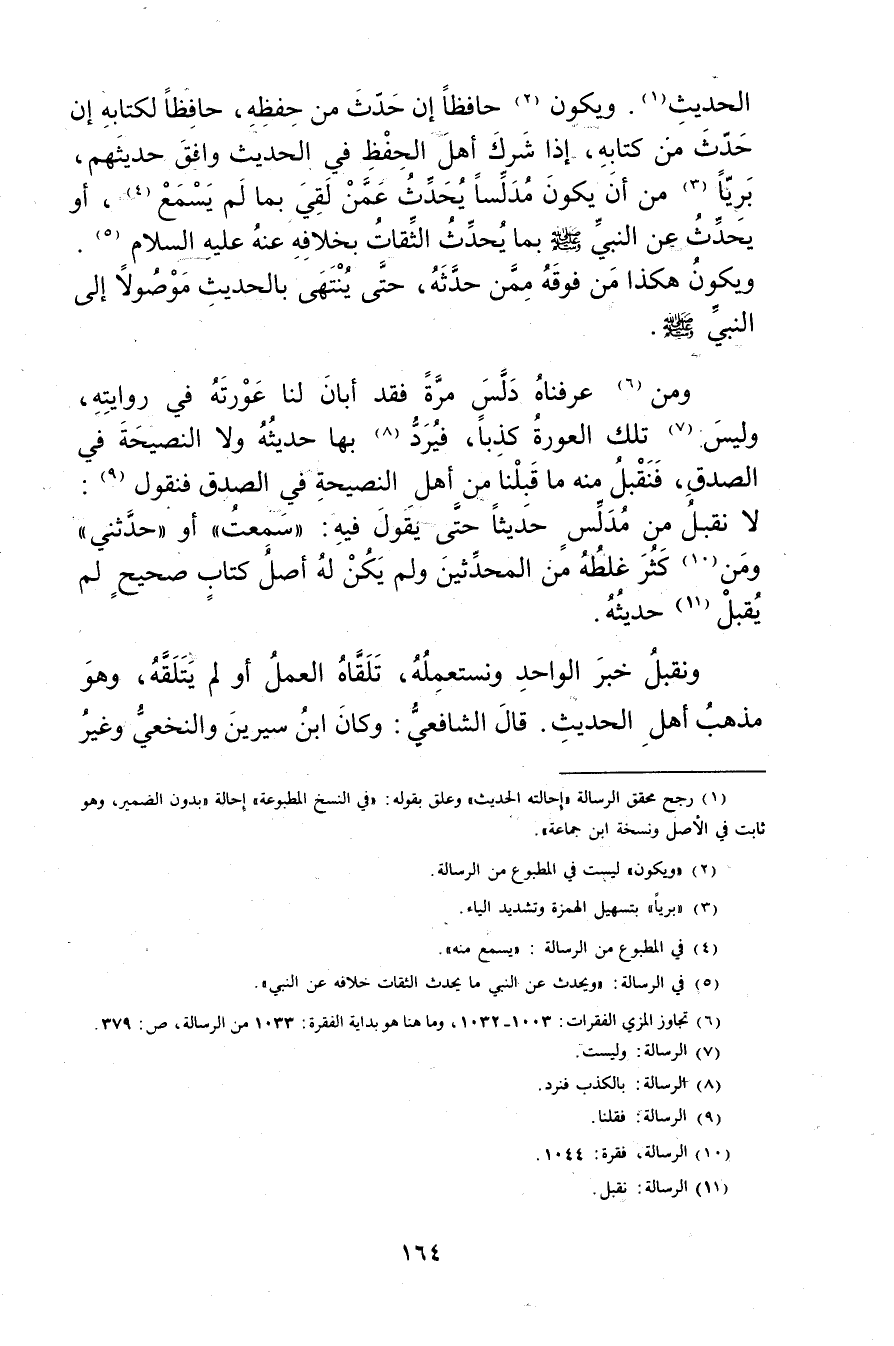 الحديث (1) . ويكون (2) حافظا إن حدث من حفظه، حافظا لكتابه إن حدث من تابه، إذا شرك أهل الحفظ في الحديث وافق حديثهم، بريا (3) من أن يكون مدلسا يحدث عمن لقي بما لم يسمع (4) ، أو يحدث عَن النَّبِيّ صَلَّى اللَّهُ عليه وسلم بما يحدث الثقات بخلافه عنه عليه السلام (5) .