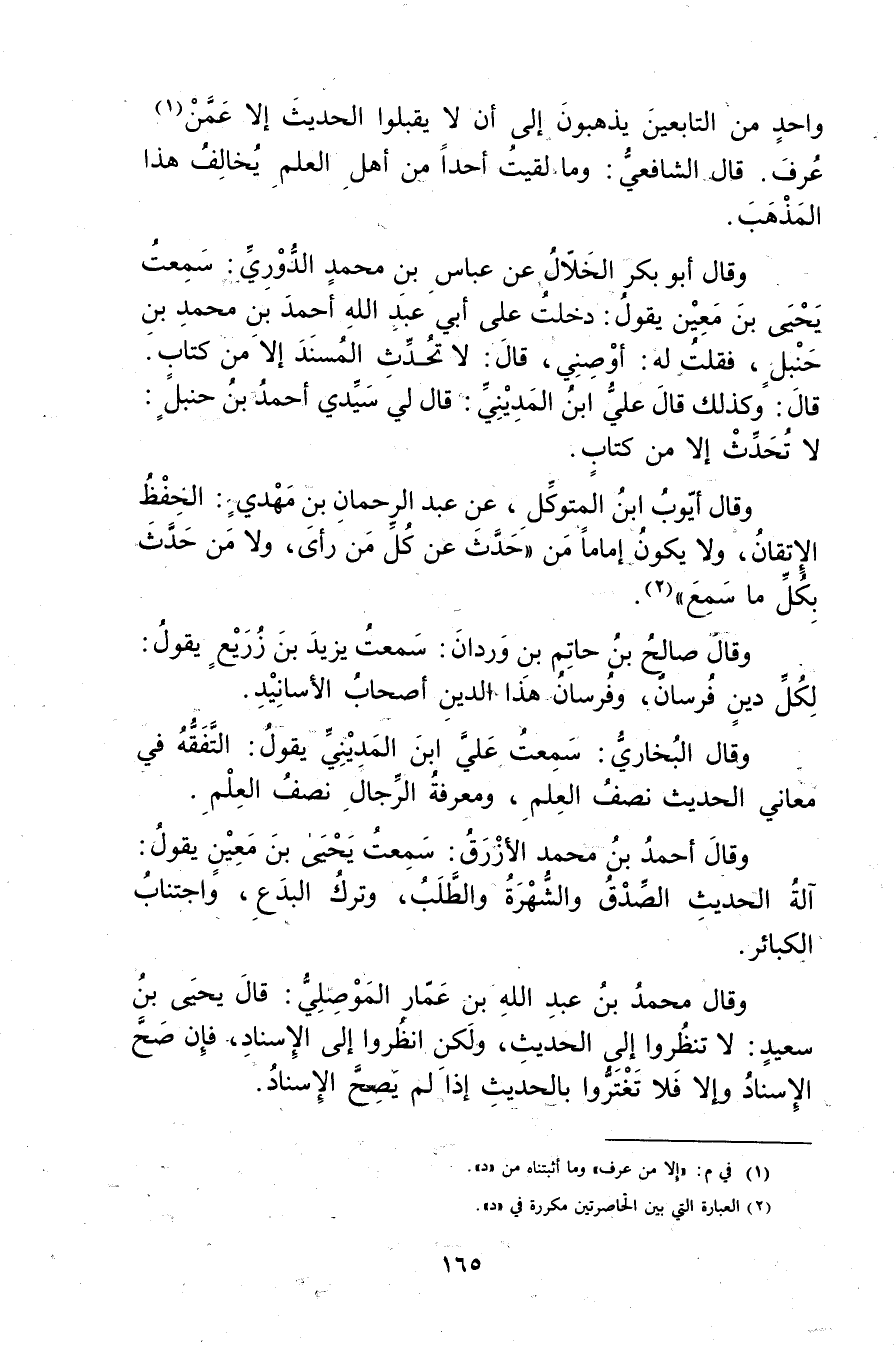 وَقَال أبو بكر الخلال عَنْ عباس بْن مُحَمَّد الدوري: سمعت يحيى بْن مَعِين يَقُول: دخلت على أَبِي عَبد اللَّهِ أَحْمَد بن محمد بن حنبل، فقلت له: أوصني، قال: لاتحدث المسند إلا من كتاب. قال: وكذلك قال علي ابن المديني: قال لي سيدي أَحْمَد بْن حَنْبَل: لا تحدث إلا من كتاب.