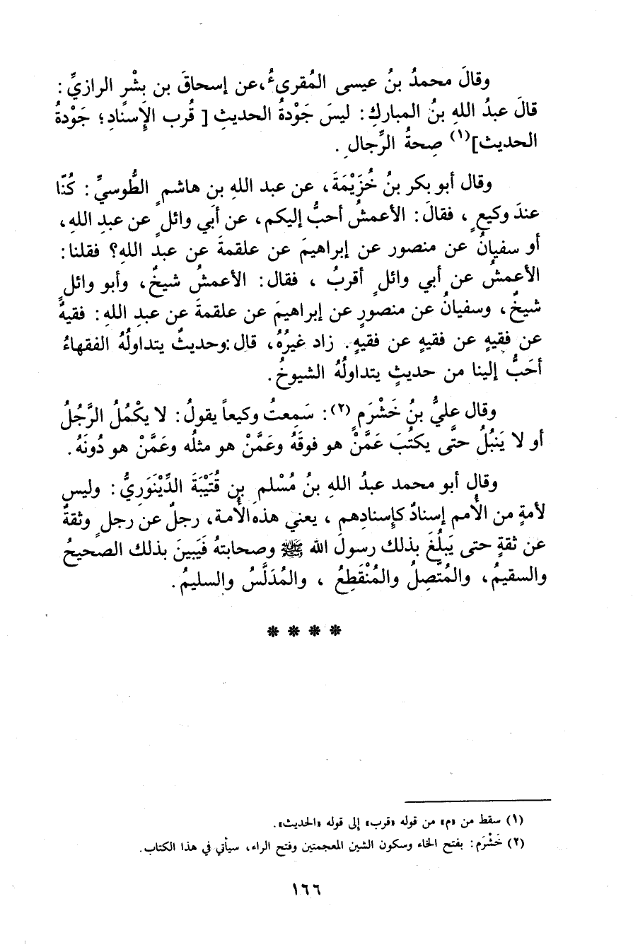 وَقَال أَبُو مُحَمَّد عَبد اللَّهِ بْن مسلم بْن قتيبة الدينوري: وليس لامة من الامم إسناد كإسنادهم، يعني هذه الامة، رجل عن رجل وثقة عن ثقة حتى يبلغ بذلك رَسُول اللَّهِ صَلَّى اللَّهُ عليه وسلم وصحابته فيبين بذلك الصحيح والسقيم، والمتصل والمنقطع، والمدلس والسليم.