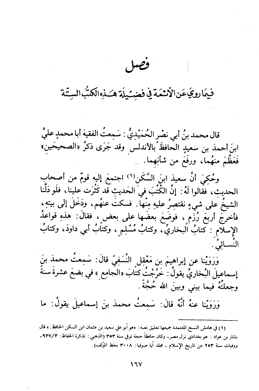 وحكي أن سَعِيد ابن السكن (1) اجتمع إليه قوم من أصحاب الحديث، فقالوا له: إن الكتب في الحديث قد كثرت علينا، فلو دلنا الشيخ على شيء نقتصر عليه منها. فسكت عنهم، ودخل إلى بيته، فأخرج أربع رزم، فوضع بعضها على بعض، فقال: هذه قواعد الاسلام: كتاب البخاري وكتاب مسلم، وكتاب أبي داود، وكتاب النَّسَائي.