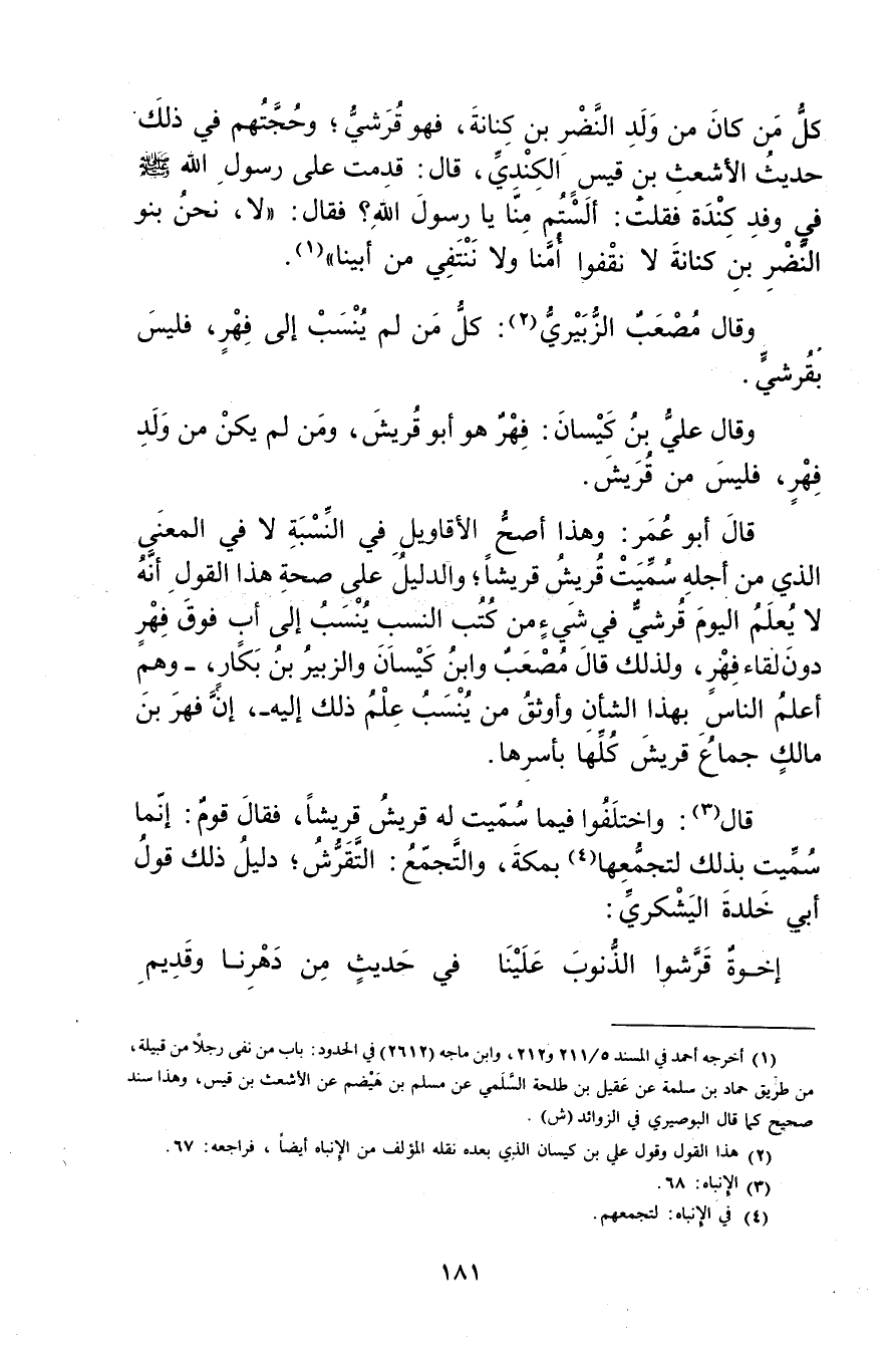 كل من كان من ولد النضر بن كنانة، فهو قرشي، وحجتهم في ذلك حديث الاشعث بن قيس الكندي، قال: قَدِمْتُ عَلَى رَسُولِ اللَّهِ صلى الله عليه وسلم فِي وفد كندة فقلت: ألستم منا يَا رَسُولَ اللَّهِ؟ فَقَالَ: لا، نَحْنُ بَنُو النَّضْرِ بْنِ كِنَانَةَ لا نقفوا أمنا ولا ننتفي من ابينا" (1) .