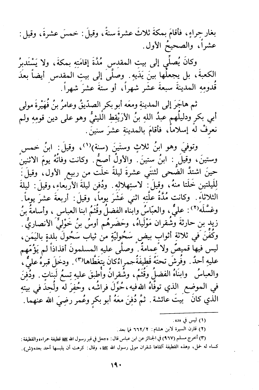 وتوفي وهُوَ ابن ثلاث وستين (سنة) (1) ، وقيل: ابن خمس وستين، وقيل: ابن ستين. والاول أصح. وكانت وفاته يوم الاثنين حين اشتد الضحى لثنتي عشرة ليلة خلت من ربيع الاول، وقيل: لليلتين خلتا منه، وقيل: لاستهلاله. ودفن ليلة الاربعاء، وقيل: ليلة الثلاثاء. وكانت مدة علته اثني عشر يوما، وقيل: أربعة عشر يوما. وغسله (2) : علي، والعباس وابناه الفضل وقثم ابنا العباس، وأسامة بْن زَيْد بْن حارثة وشقران مولياه، وحضرهم أوس بن خولي الأَنْصارِيّ. وكفن في ثلاثة أثواب بيض سحولية من ثياب سحول بلدة باليمن، ليس فيها قميص ولا عمامة. وصلى عليه المسلمون أفذاذا لم يؤمهم عليه أحد. وفرش تحته قطيفة حمراء كان يتغطاها (3) . ودخل قبره علي، والعباس وابناه الفضل وقثم، وشقران وأطبق عليه تسع لبنات. ودفن في الموضع الذي توفاه الله فيه، حول فراشه، وحفر له ولحد في بيته الذي كان بيت عائشة. ثم دفن معه أبو بكر وعُمَر رضي الله عنهما.