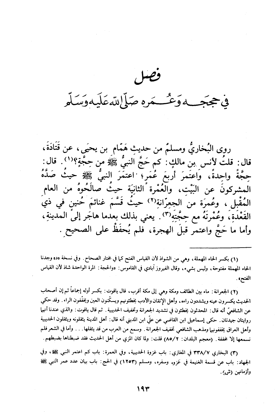 (3) البخاري 7 / 338 في المغازي: باب غزوة الحديبية، وفي العُمَرة: باب كم اعتمر النبي صلى الله عليه وسلم، وفي الجهاد: باب عن قسمة الغنيمة في غزوة وسفره، ومسلم (1253) في الحج: باب بيان عدد عُمَر النبي صلى الله عليه وسلم وأزمانهن (ش) .