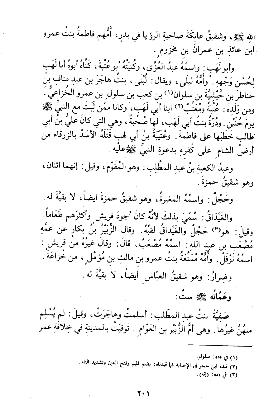 وأبو لهب: واسمه عبد العزى، وكنيته أبو عتبة، كناه أبوه أبا لهب لحسن وجهه. وأمه ليلى، ويُقال: لبني، بنت هاجر بن عبد مناف بن حناطر بن حبشية بن سلوان (1) بن كعب بن سلول بن عَمْرو الخزاعي. ومن ولده: عتبة ومعتب (2) ابنا أبي لهب، وكانا ممن ثبت مع النَّبِيّ صَلَّى اللَّهُ عَلَيْهِ وسلم يوم حنين. ودرة بنت أبي لهب، لها صحبة، وهي التي كَانَ عَلِي بْن أَبي طَالِب خطبها على فاطمة. وعتيبة بن أَبي لهب قتله الاسد بالزرقاء من أرض الشام على كفره بدعوة النبي صَلَّى اللَّهُ عليه وسلم عليه.