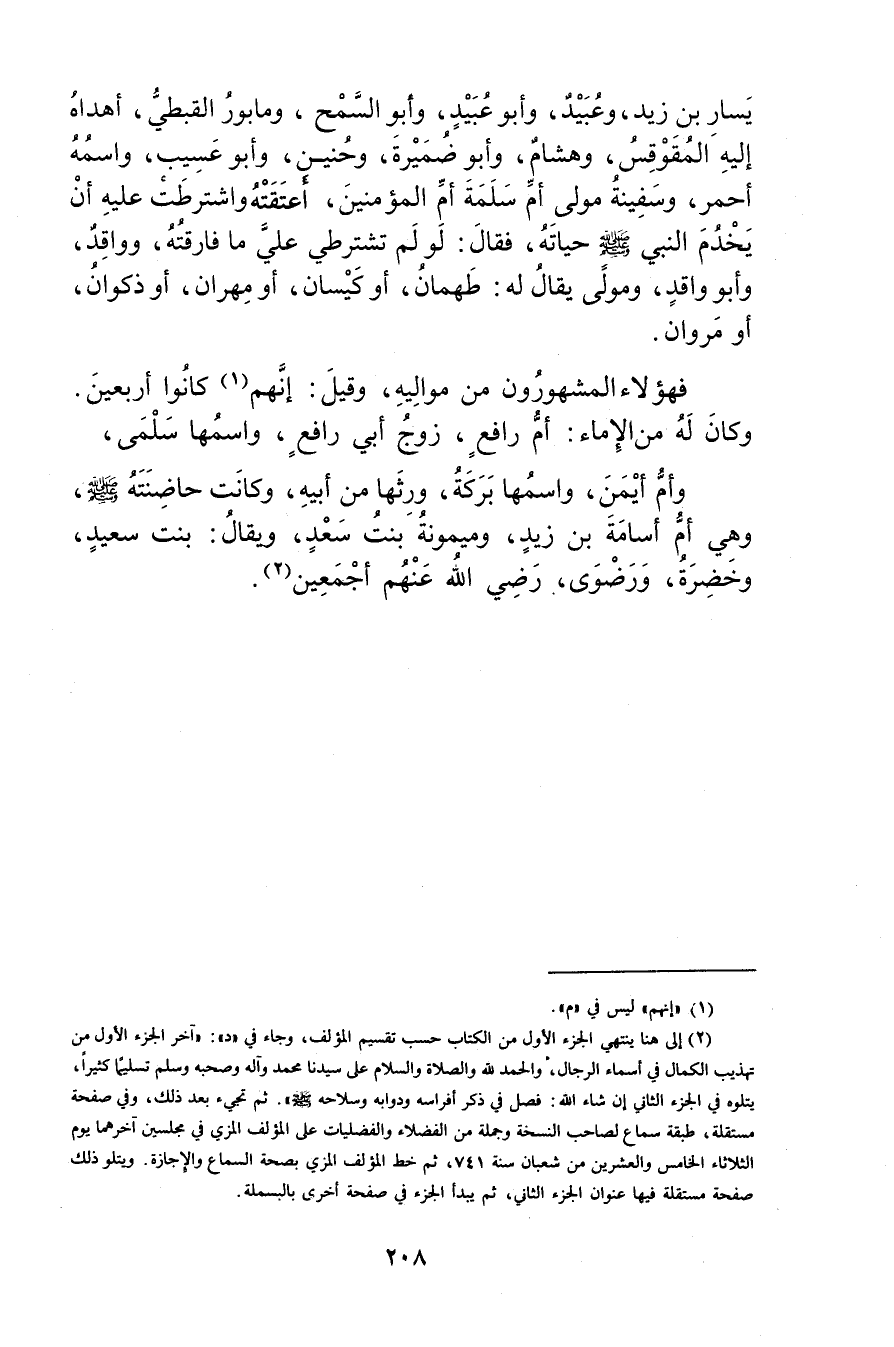 (2) إلى هنا ينتهي الجزء الاول من الكتاب حسب تقسيم المؤلف، وجاء في "د": آخر الجزء الاول من تهذيب الكمال في أسماء الرجال، والحمد لله والصلاة والسلام على سيدنا محمد وآله وصحبه وسلم تسليما كثيرا، يتلوه في الجزء الثاني إن شاء الله: فصل في ذكر أفراسه ودوابه وسلاحه صَلَّى اللَّهُ عَلَيْهِ وسَلَّمَ".ثُمَّ تجئ بعد ذلك، وفي صفحة مستقلة، طبقة سماع لصاحب النسخة وجملة من الفضلاء والفضليات على المؤلف المزي في مجلسين آخرهما يوم الثلاثاء الخامس والعشرين من شعبان سنة 741، ثم خط المؤلف المزي بصحة السماع والاجازة. ويتلو ذلك صفحة مستقلة فيها عنوان الجزء الثاني، ثم يبدأ الجزء في صفحة أخرى بالبسملة.