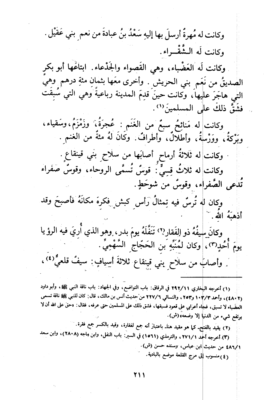 وكانت له العضباء، وهي القصواء والجدعاء. ابتاعها أبو بكر الصديق من نعم بني الحريش. وأخرى معها بثمان مئة درهم وهي التي هاجر عليها، وكانت حين قدم المدينة رباعية وهي التي سبقت فشق ذلك على المسلمين (1) .