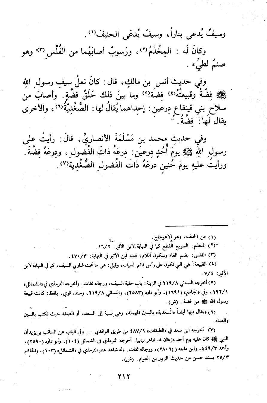 (5) أخرجه النَّسَائي 8 / 219 في الزينة: باب حلية السيف، ورجاله ثقات: وأخرجه التِّرْمِذِيّ في "الشمائل"1 / 192، وفي"الجامع" (1691) ، وأبو داود (2583) ، والنَّسَائي 8 / 219، وسنده قوي، بلفظ: كانت قبيعة رسول الله صلى الله عليه وسلم من فضة. (ش) .