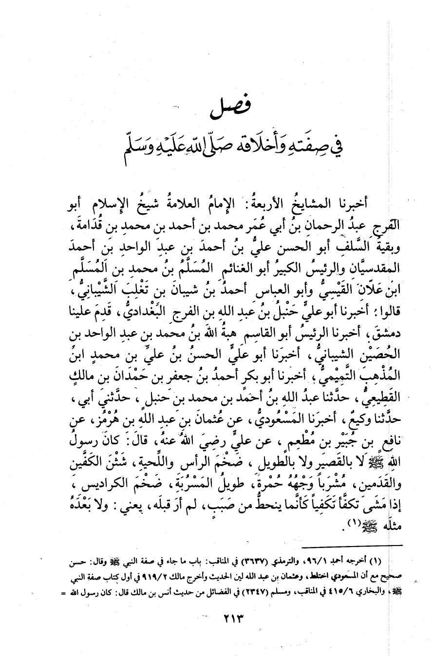 أخبرنا المشايخ الأربعة: الإمام العلامة شيخ الإسلام أَبُو الْفَرَجِ عَبْدُ الرَّحْمَنِ بْنُ أَبي عُمَر مُحَمَّدِ بْنِ أَحْمَدَ بْنِ محمد بن قدامة، وبقية السلف أَبُو الْحَسَن علي بْن أَحْمَد بْنِ عَبْدِ الْوَاحِدِ بْنِ أَحْمَدَ المقدسيان والرئيس الكبير أَبُو الغنائم المسلم بْن مُحَمَّد بن المسلم ابن عَلانَ الْقَيْسِيُّ وأَبُو الْعَبَّاسِ أَحْمَدُ بْن شيبان بْن تغلب الشَّيْبَانِيّ، قَالُوا: أَخْبَرَنَا أَبُو عَلِيٍّ حَنْبَلُ بْنُ عَبد اللَّهِ بْنِ الْفَرَجِ البغدادي، قدم علينا دمشق، أَخْبَرَنَا الرَّئِيسُ أَبُو الْقَاسِمِ هِبَةُ اللَّهِ بْن مُحَمَّد بْن عَبْد الْوَاحِدِ بْنِ الْحُصَيْنِ الشَّيْبَانِيُّ، أَخْبَرَنَا أَبُو عَلِيٍّ الْحَسَنُ بْنُ عَلِيِّ بن محمد ابن الْمُذْهِب التَّمِيمِيُّ، أَخْبَرَنَا أَبُو بَكْرٍ أَحْمَدُ بْنُ جَعْفَرِ بْنِ حَمْدَانَ بْنِ مَالِكٍ القَطِيعِيّ، حَدَّثَنَا عَبد الله بْن أَحْمَد بْن مُحَمَّد بْنِ حَنْبَلٍ، حَدَّثني أَبِي، حَدَّثَنَا وكعى، أخبرنا المسعودي، عن عُثْمَانَ بْنِ عَبد اللَّهِ بن هرمز، عَنْ نَافِعِ بْنِ جُبَيْرِ بْنِ مطعم، عن علي رضي الله عنه، قال: كَانَ رَسُولُ اللَّهِ صَلَّى الله عليه وسلم لا بالقصير ولا بالطويل، ضخم الرأس واللحية، شثن الكفين والقدمين، مشربا وجهه حمرة، طويل المسربة، ضخم الكراديس، إِذَا مَشَى تَكَفَّأَ تَكَفُّيًا كَأَنَّمَا ينحط مِنْ صَبَبٍ، لَمْ أَرَ قَبْلَهُ، يعني: ولا بعده مثله صَلَّى اللَّهُ عَلَيْهِ وسَلَّمَ (1) .