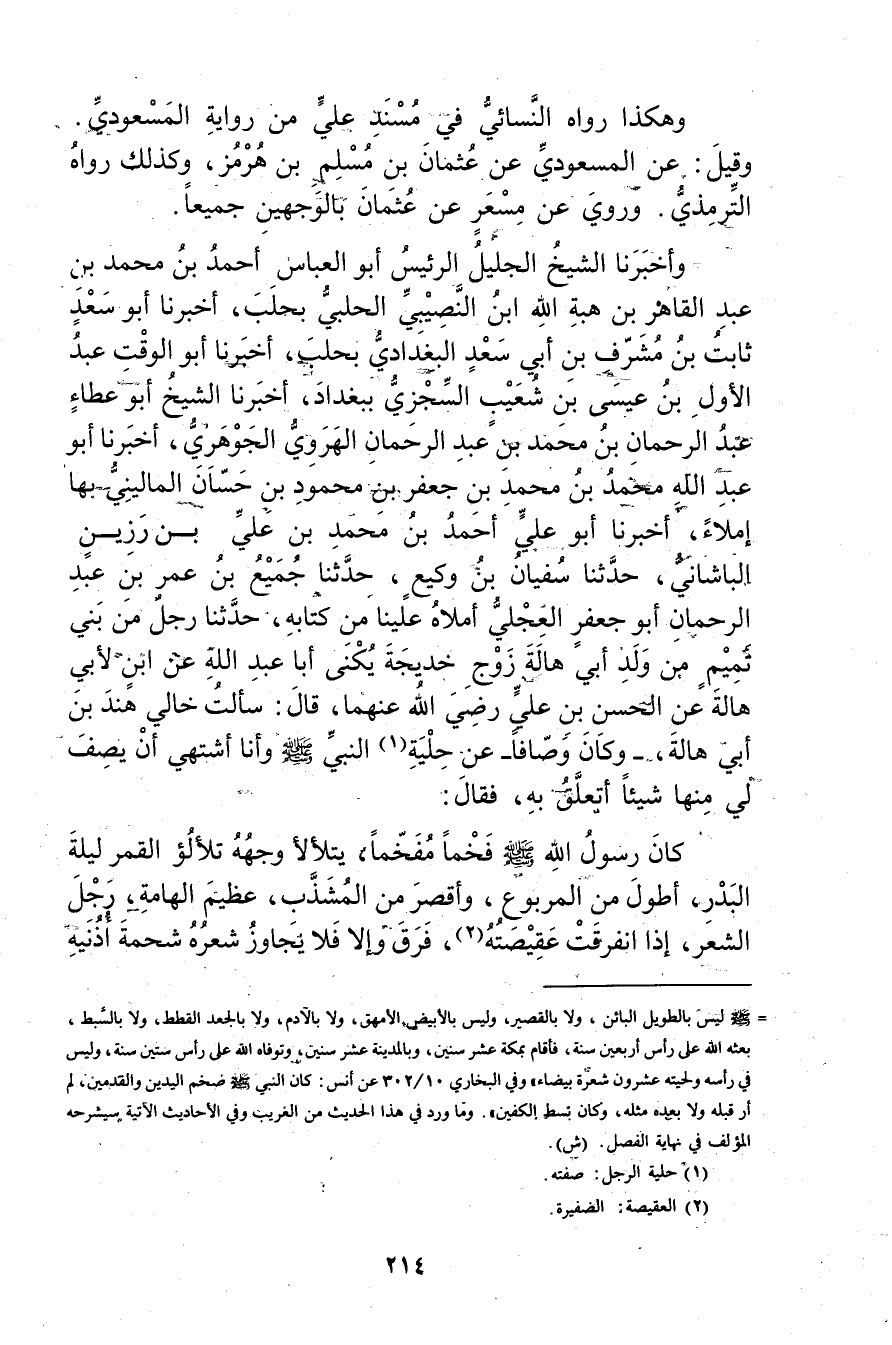 وأخبرنا الشيخ الجليل الرئيس أَبُو الْعَبَّاسِ أَحْمَدُ بْنُ محمد بن عبد القاهر بْنِ هِبَةِ اللَّهِ بْنِ النُّصَيْبِيِّ الحلبي بحلب، أخبرنا أبو سَعْدٍ ثَابِتُ بْنُ مُشَرِّفِ بْنِ أَبي سَعْدٍ الْبَغْدَادِيُّ بحلب، أخبرنا أَبُو الْوَقْتِ عَبْدُ الأَوَّلِ بْنُ عِيسَى بْنِ شُعَيْبٍ السِّجْزِيُّ ببغداد، أخبرنا الشيخ أبو عطاء عَبْدُ الرَّحْمَنِ بْنُ مُحَمَّدِ بْنِ عبد الرحمن الهروي الجوهري، أَخْبَرَنَا أَبُو عَبد اللَّهِ مُحَمَّد بْن مُحَمَّد بْن جَعْفَر بْن محمود بن حسان الماليني بها إملاء، أخبرنا أَبُو عَلِيٍّ أَحْمَدُ بْنُ مُحَمَّد بْن عَلِيّ بْن رزين الباشاني، حَدَّثَنَا سفيان بن وكيع، حَدَّثَنَا جميع بن عُمَر بن عَبْدِ الرحمن أبو جعفر العجلي أملاه علينا من كتابه، حَدَّثَنَا رجل من بني تميم بن ولد أبي هالة زوج خديجة يكنى أبا عَبد اللَّهِ عن ابن لأبي هالة عن الحسن بْن عَلِيّ رضي اللَّه عنهما، قال: سألت خالي هند بْن أَبي هالة، وكَانَ وصافا عن حلية (1) النَّبِيّ صَلَّى اللَّهُ عليه وسلم وأنا أشتهي أن يصف لي منها شيئا أتعلق به، فَقَالَ:
