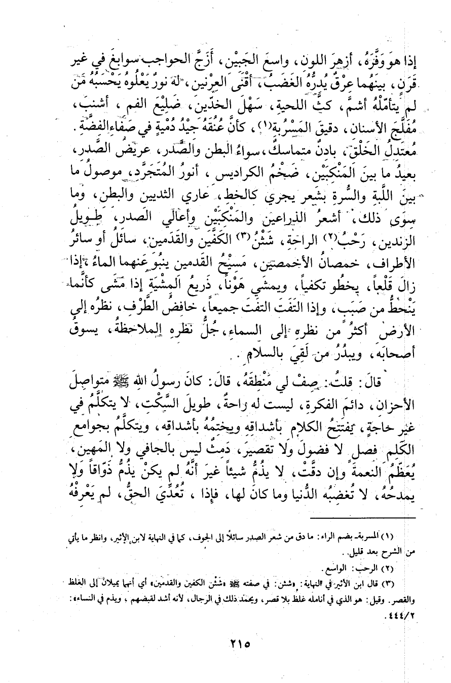 (3) قال ابن الاثير في النهاية: شئن: في صفته صلى الله عليه وسلم"شثن الكفين والقدمين"أي أنهما يميلان إلى الغلظ والقصر.