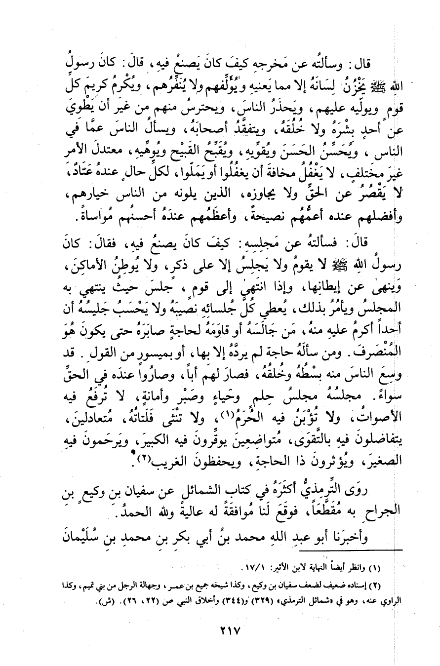 قال: وسألته عن مخرجه كيف كان يصنع فيه، قال: كَانَ رَسُولُ اللَّهِ صَلَّى الله عليه وسلم يخزن لسانه إلا مما يعنيه ويؤلفهم ولا ينفرهم، ويكرم كريم كل قوم ويوليه عليهم، ويحذر الناس، ويحترس منهم من أن يطوي عن أحد بشره ولا خلقه، ويتفقد أصحابه، ويسأل الناس عما في الناس، ويحسن الحسن ويقويه، ويقبح القبيح ويوهيه، معتدل الامر غير مختلف، لا يغفل مخافة أن يغفلوا أو يملوا، لكل حال عنده عتاد، لا يقصر عن الحق ولا يجاوزه، الذين يلونه من الناس خيارهم، وأفضلهم عنده أعمهم نصيحة، وأعظمهم عنده أحسنهم مواساة.