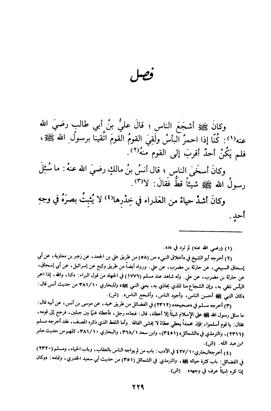 وكان صلى الله عليه وسلم أشجع الناس، قال عَلِيُّ بْنُ أَبي طَالِبٍ رضي الله عنه (1) : كنا إذا احمر الباس ولقي القوم القوم اتقينا بِرَسُولِ اللَّهِ صَلَّى اللَّهُ عَلَيْهِ وسلم، فلم يكن أحد أقرب إلى القوم منه (2) .