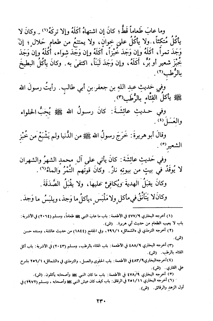 وما عاب طعاما قط، كان إن اشتهاه أكله وإلا تركه (1) . وكان لا يأكل متكئا، ولا يأكل على خوان، ولا يمتنع من طعام حلال، إن وجد تمرا، أكله وإن وجد خبزا، أكله وإن وجد شواء، أكله وإن وجد خبز شعير أو بر، أكله، وإن وجد لبنا، اكتفى به. وكان يأكل البطيخ بالرطب (2) .